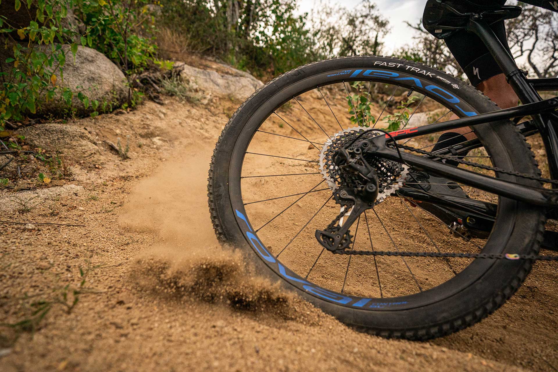 My test bike for the test was a carbon Specialized Epic full suspension bike, the kind of machine you’d expect to be racing these wheels. Tyres were initially a pair of Specialized Fast Track – minimally treaded XC race tyres, though I did swap to a front Ground Control after a couple of rides, just for a bit more steering precision in the soft granite soil. Incidentally, it went up with a standard track pump.