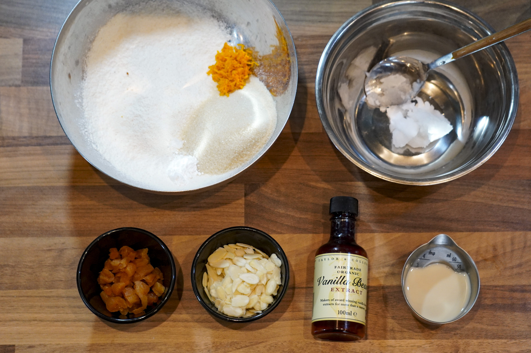 Add flour, baking powder, caster sugar, pinch of salt and orange zest in one bowl. Set aside.