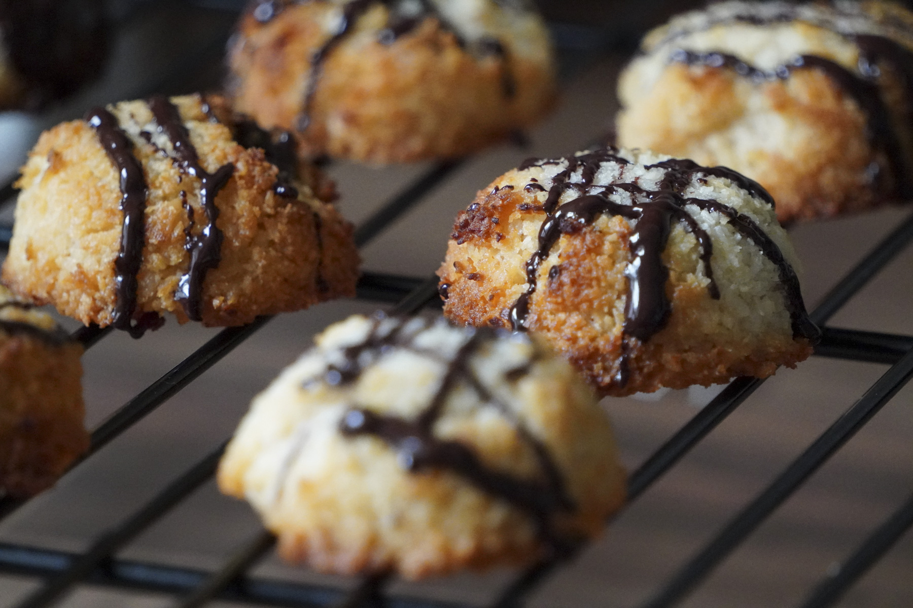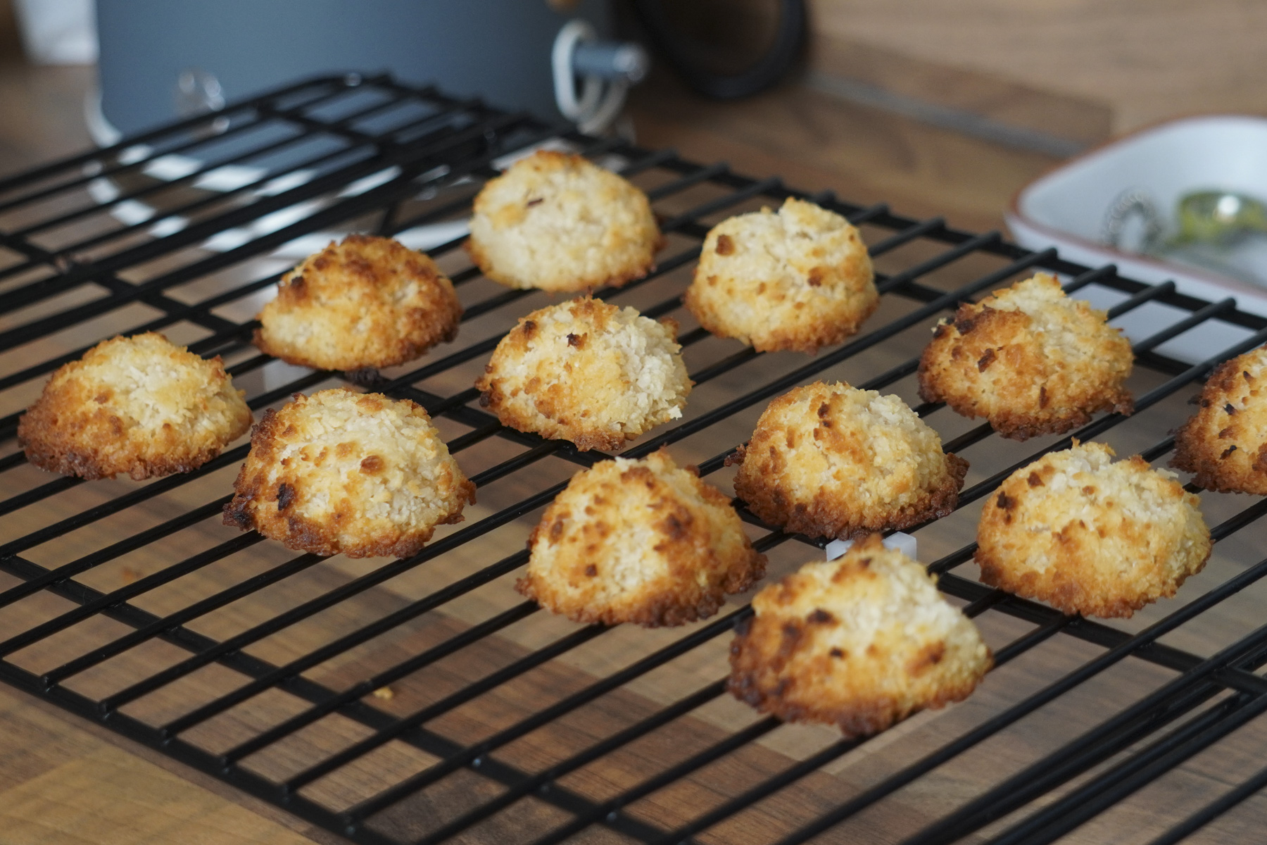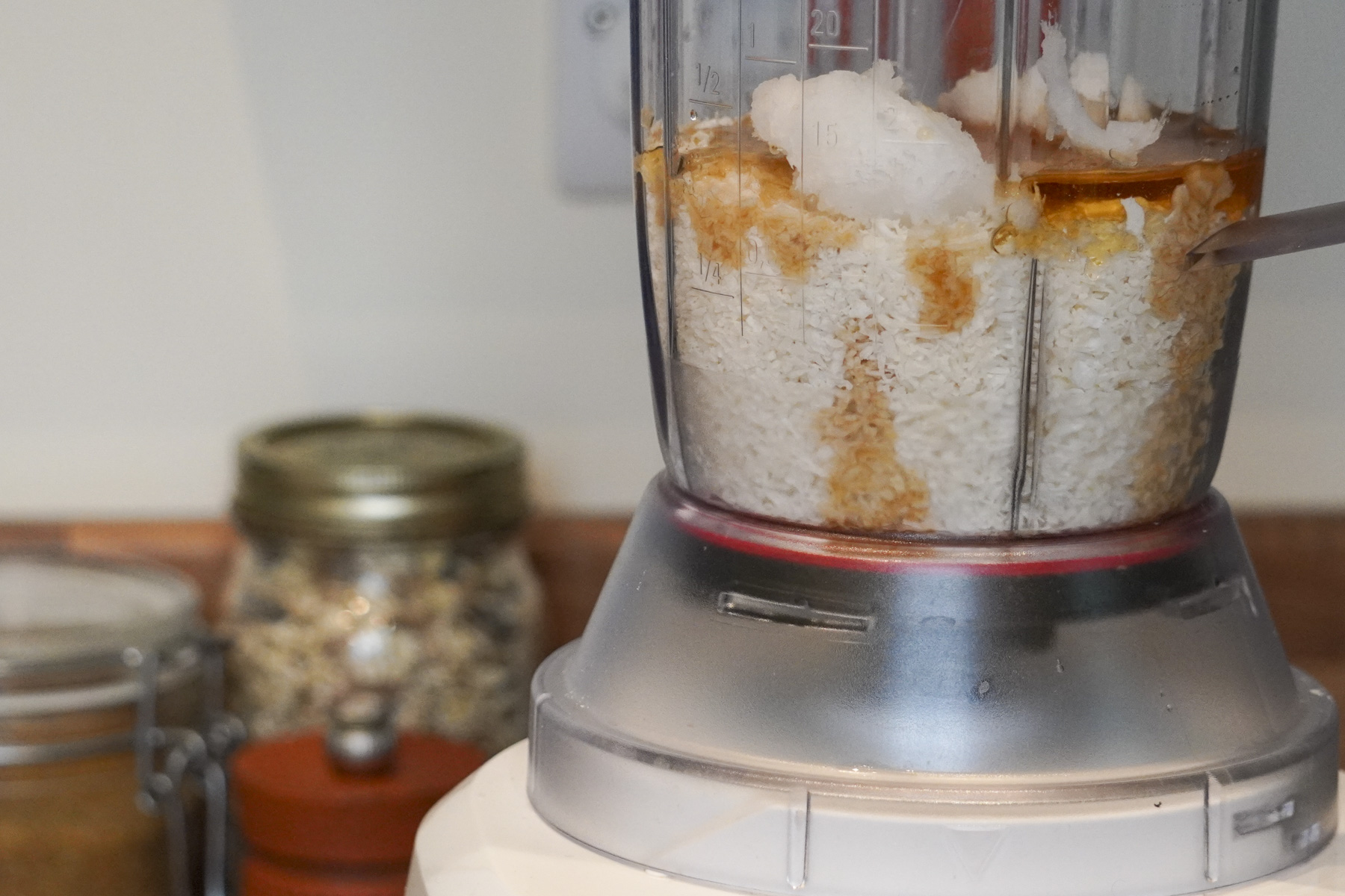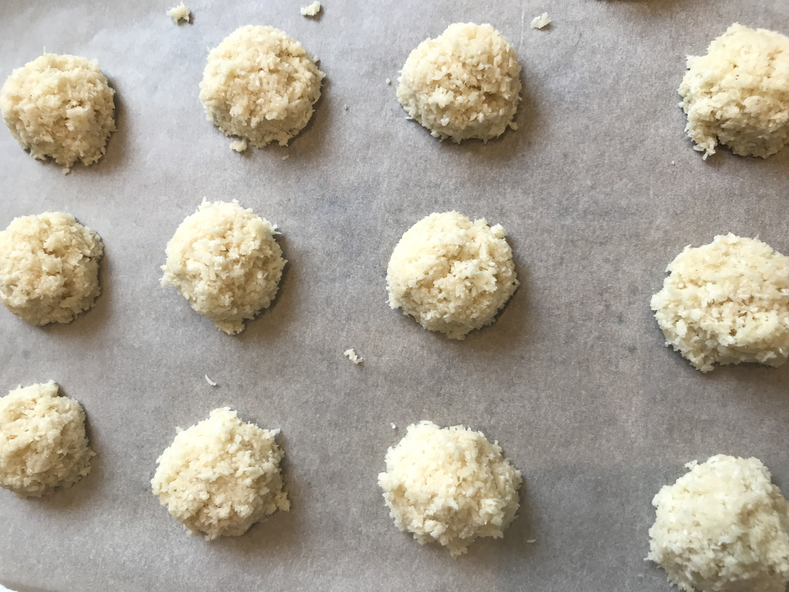 Put coconut and flour in a food processor or blender. Pulse in the rest of the ingredients until your dough forms a ball. Scoop with a tablespoon or measuring spoon onto baking paper. Bake at 180°C for 7 minutes.