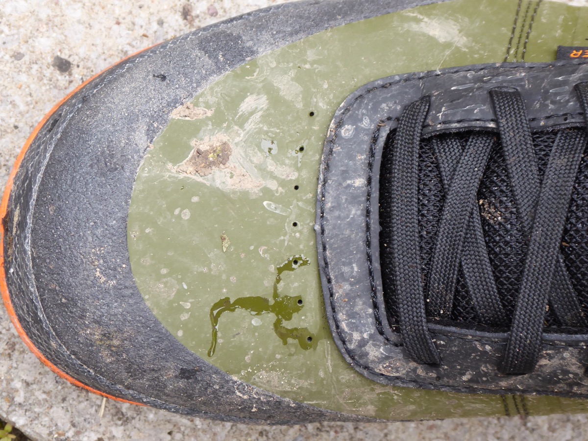 In the three months that I’ve had these shoes it hasn’t rained significantly – Not something I’d ever thought of say being a resident of Manchester! In fact, when I first submitted this review Hannah asked me what they were like in the wet, to which my answer was “Dunno”. However, the very next weekend it tipped down, so I set aside my usual lockdown activities of reluctant DIY, playing boardgames badly and starting arguments, and went on a ride as requested. To answer the question: they let in water, lots of water. The near solid uppers are OK up to a point at keeping your feet dry when riding in wet grass, but as soon as it gets too long or you hit a puddle that splashes over the tongue it is getting in and staying there. The curious holes mentioned earlier act like little drains, as an hour after I had got back I was still squelching out water through them. Twenty four hours later they were still soaking, even after spending few hours exposed to the sun and wind on top of the shed roof. Not something that would put me off the shoe to be honest, as my old pair were just as bad, it is just that the look of these to me suggested that they would be better. On a particularly wet day if it was cold I’d wear an overshoe.