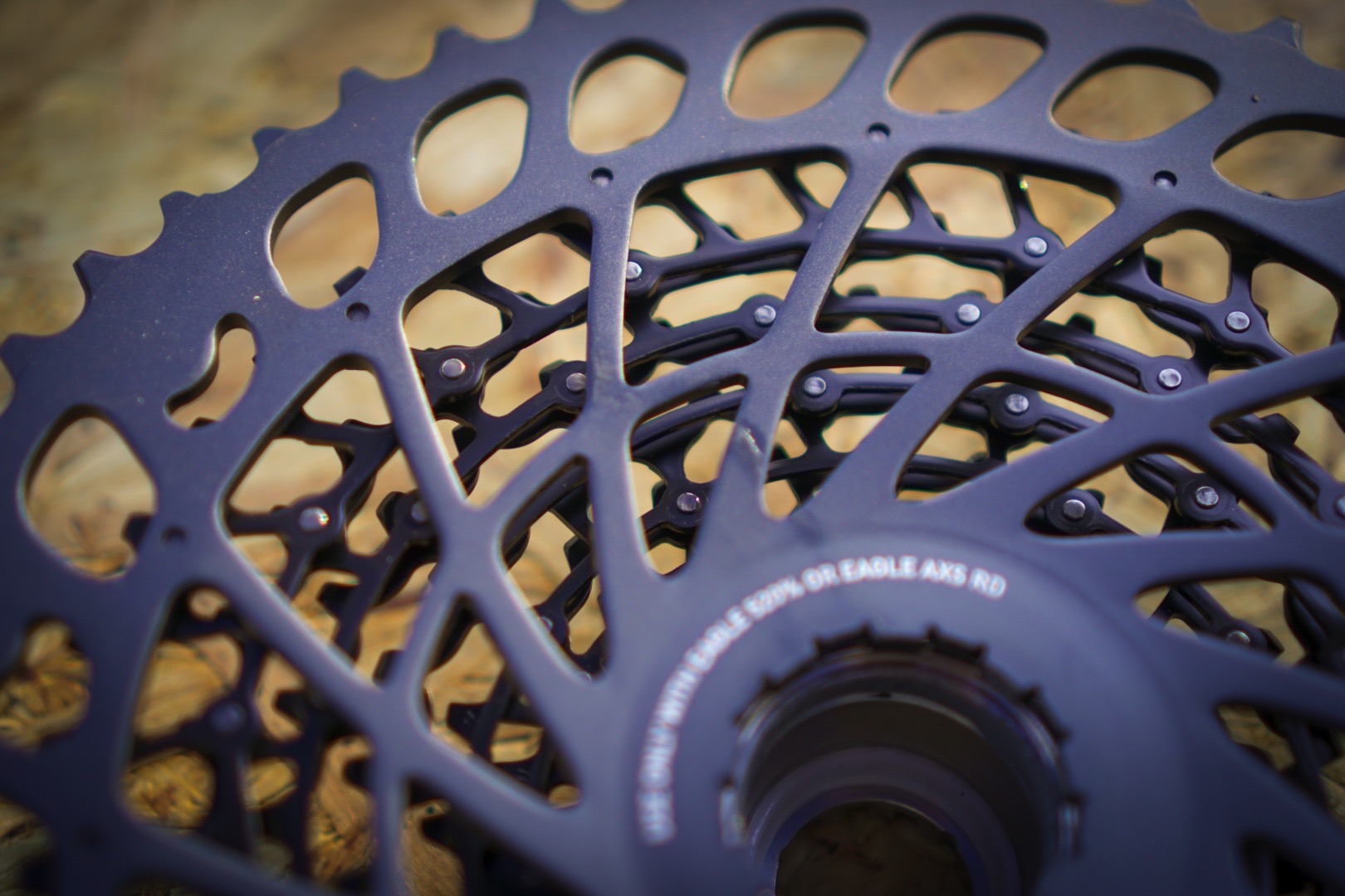 Construction is similar to that of the original GX Eagle cassette using aluminium for the largest cog and stamped and pinned steel for the remaining 11. Each cog in the cassette is heavily machined to remove any unwanted material helping to reduce the overall weight, while also increasing mud clearance. SRAM’s FULL PIN technology holds all the pieces together with stainless steel pins.