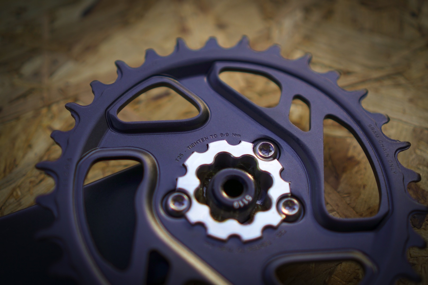 The carbon crankset uses a proprietary carbon layup, is compatible with any 1 x drivetrain and of course uses SRAM’s DUB standard bottom bracket system for improved fit and sealing. The X Sync 2 ring mounts directly to the chainset and also features that new Lunar finish.