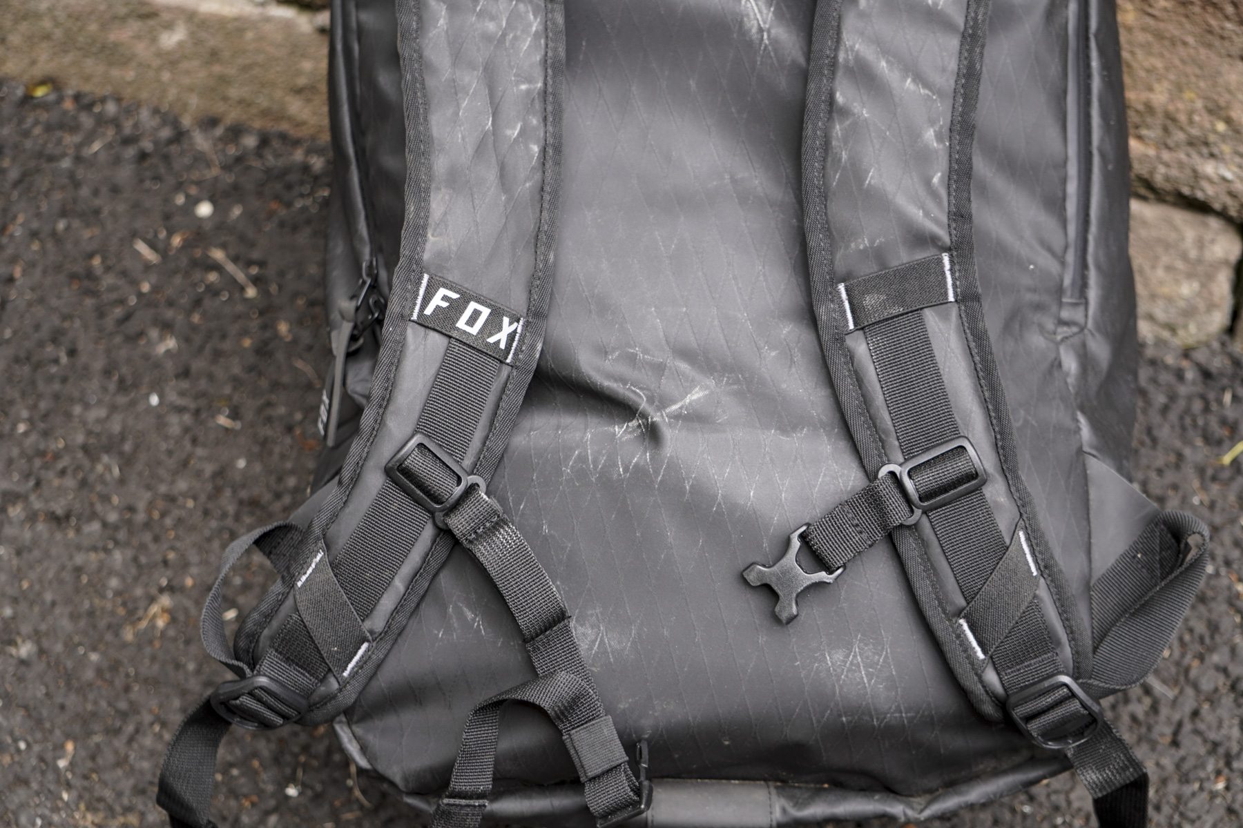 The Fox Transition duffel bag has a couple of handles paired with backpack straps for ultimate convenience. Having the option of throwing it on my back has made a huge difference in how much I use this bag, it’s really handy being able to ride places with it. There is an adjustable sternum strap to help keep the load in place, but I have found that if I pack the bag wrong it can hang really weirdly on my back. Having said that, it’s not built for performance on the trail, it’s built for transporting everything you need to and from the trail.