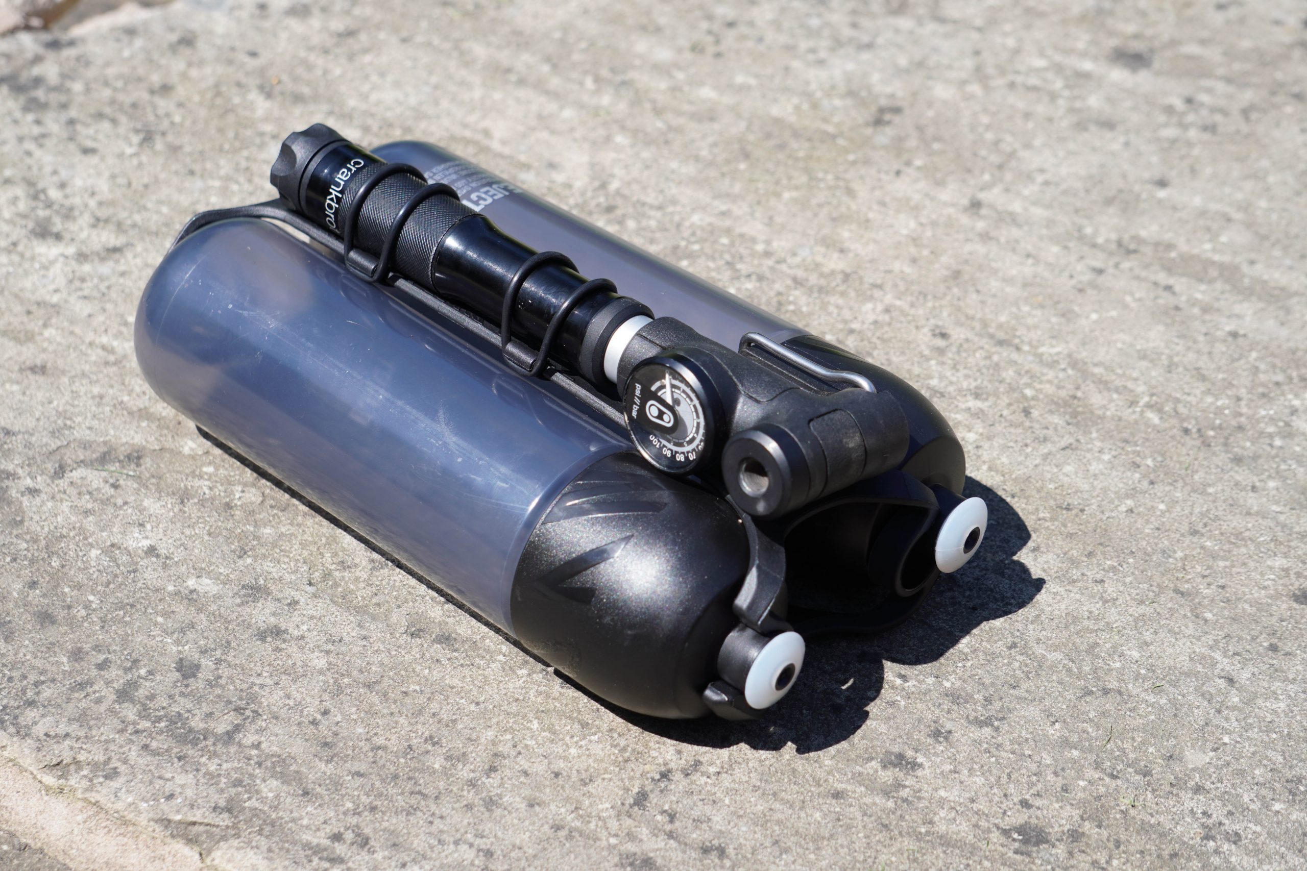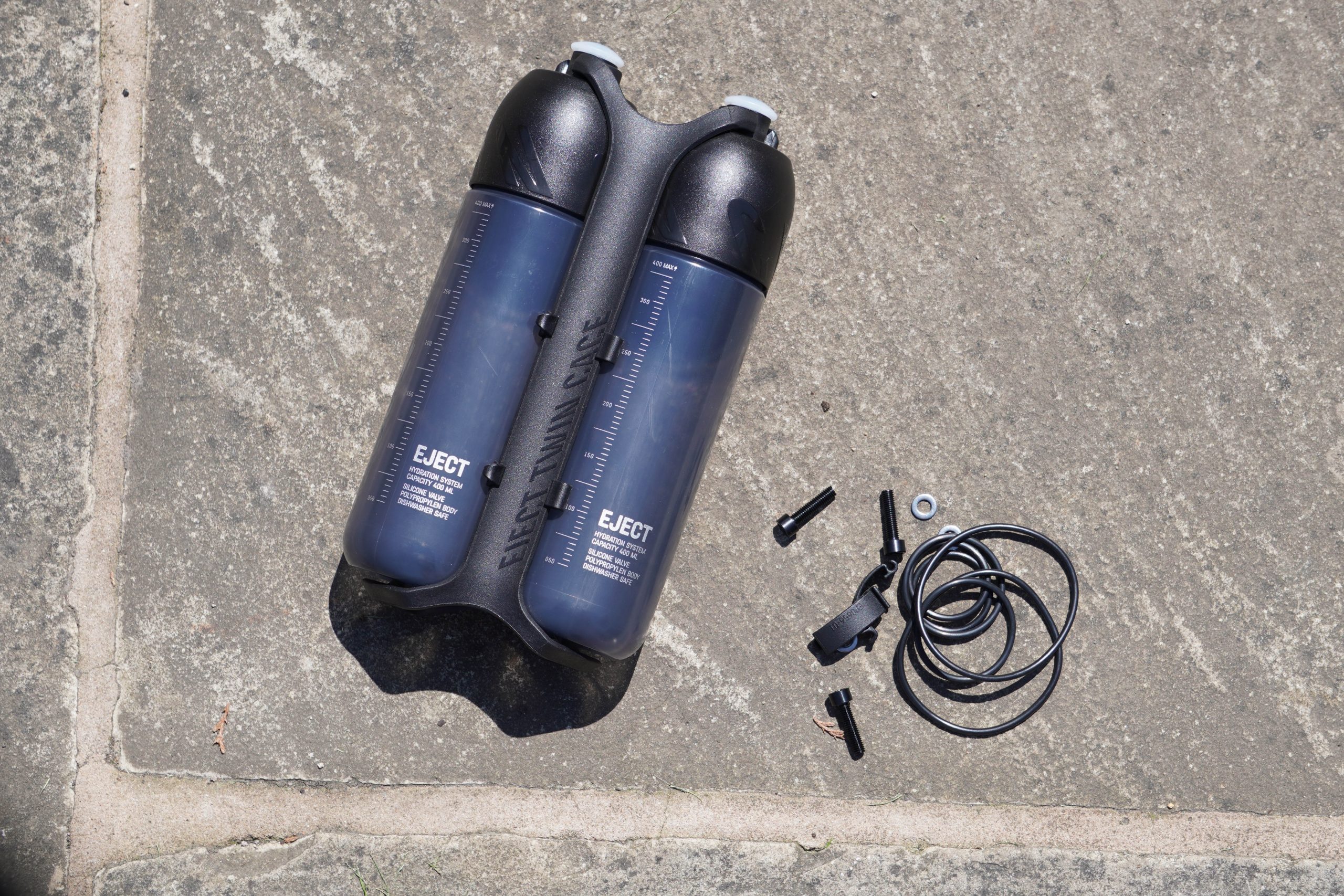 Designed with small frames in mind, the Canyon Eject Hydration System is two 400ml bottle side loaded into a cage that has some handy hooks on top to load your tube, pump etc. onto.