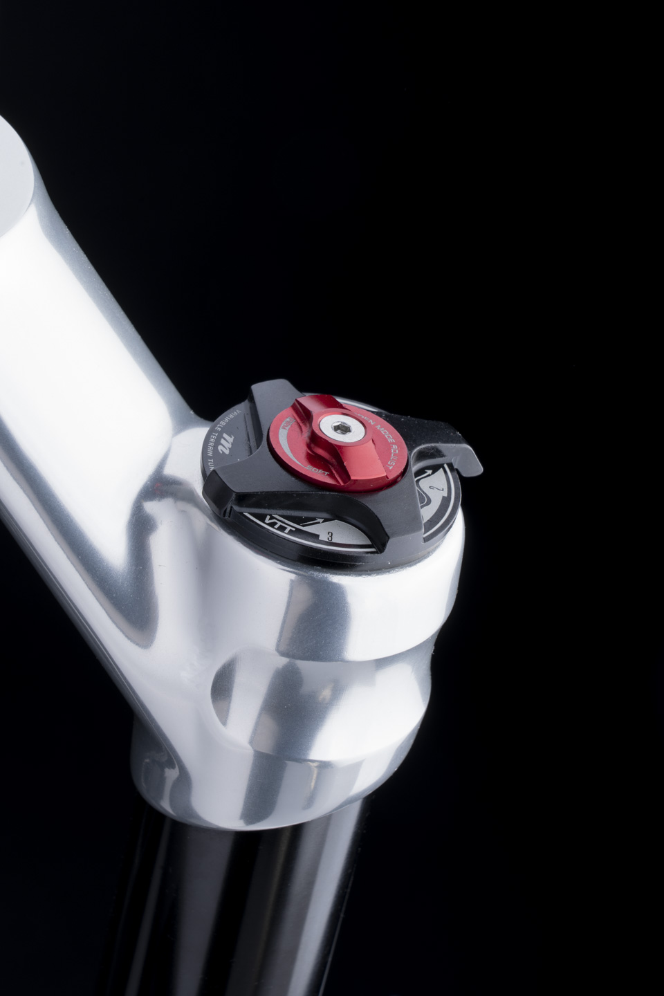 The Variable Terrain Tune (VTT) Pro damper claims to overcome the downside to many dampers with firm lockout modes by eliminating high-speed spikes while maintaining the lock-out force demanded by most XC users. This allows the fork to have a less progressive high-speed response while maintaining some low-speed support without getting wallowy. Independent shimstacks (one for lockout and one for the other two positions) manipulate the characteristic of the damper to be locked out, digressive, or progressive.