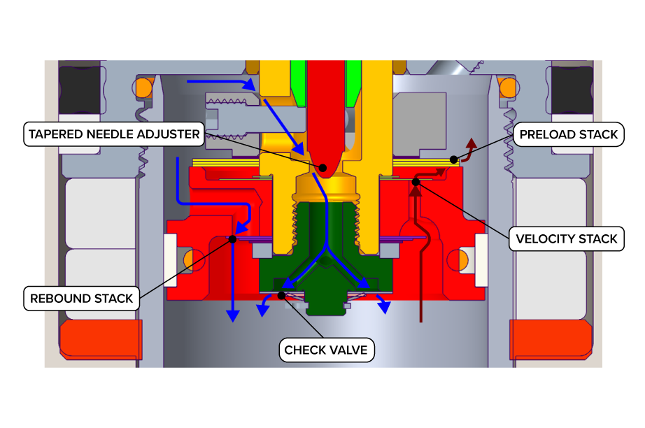 Also included on the air leg is Incremental Volume Adjust (IVA). The IVA modifies the volume in the positive air chamber with a set of self-contained spacers which dictate the fixed position of the IVA piston. This self-contained volume reduction system has five different settings allowing ramp-up tuneability without the need for additional parts.