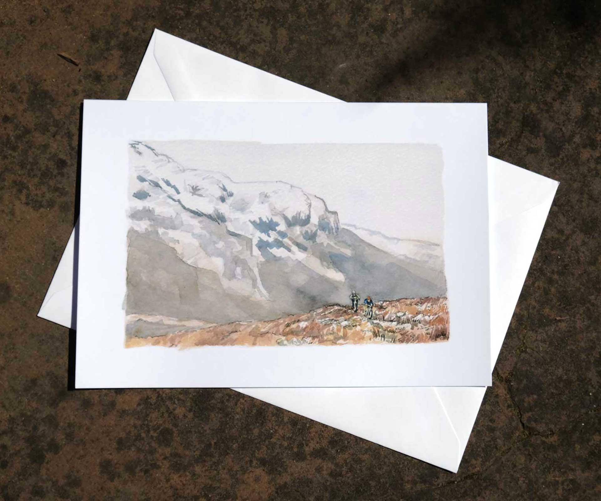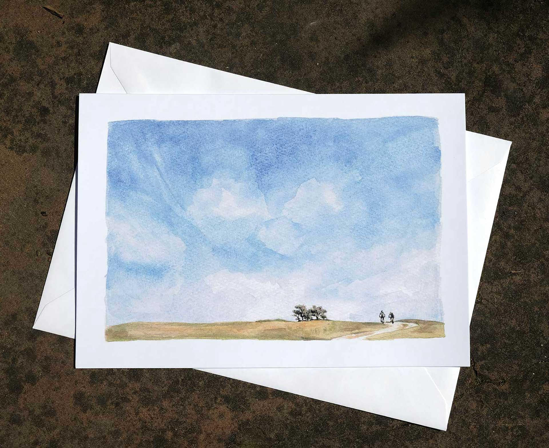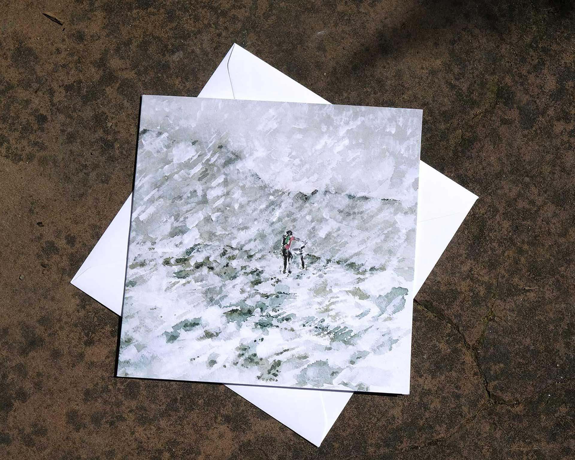 Here we have a selection of cards printed with watercolours from our classic ride illustrations, so you can send your friends and family a bit of mountain biking joy. The four watercolours are: Pennine Bridleway In The Snow (148mm x 148mm), South Downs Big Sky A5 (210mm x 148mm), Calderdale Descent (148mm x 105mm), Glen Sligachan Dark Mountain (210mm x 148mm). They are blank on the inside, and are supplied with a nice envelope too.
