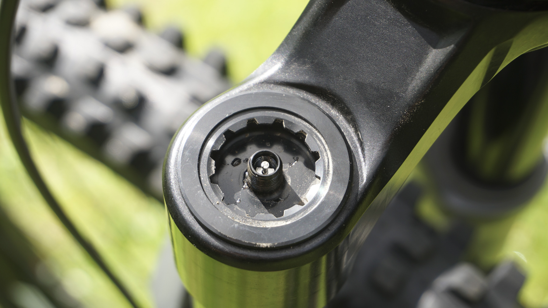 Look over to the left hand side and you’ll see the familiar air cap and valve. As with other RockShox forks, the Zeb also utilises the Bottomless Token system which allows for fine tuning the performance. The tokens screw into the underside of the air cap which is accessed using a standard cassette tool.