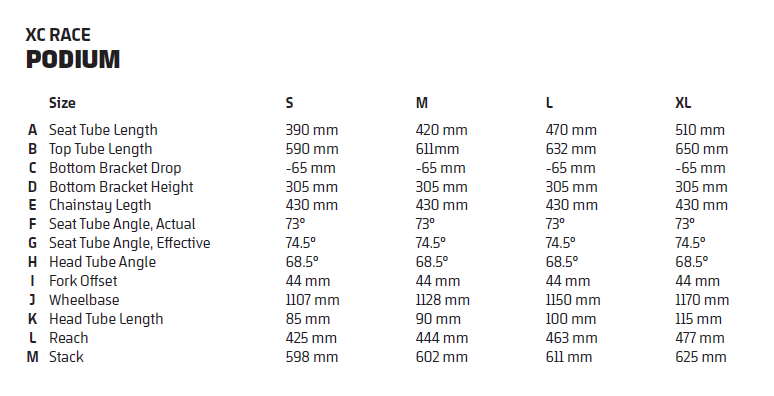 “The 2021 Podium frame features XC Forward Geometry – a new take on Mondraker’s famously innovative Forward Geometry that has seen huge success in the gravity world. Its super-long reach and joined with a shorter stem gives quick and precise handling across all four frame sizes (S: 390mm / M: 420mm / L: 470mm / XL: 510mm).”