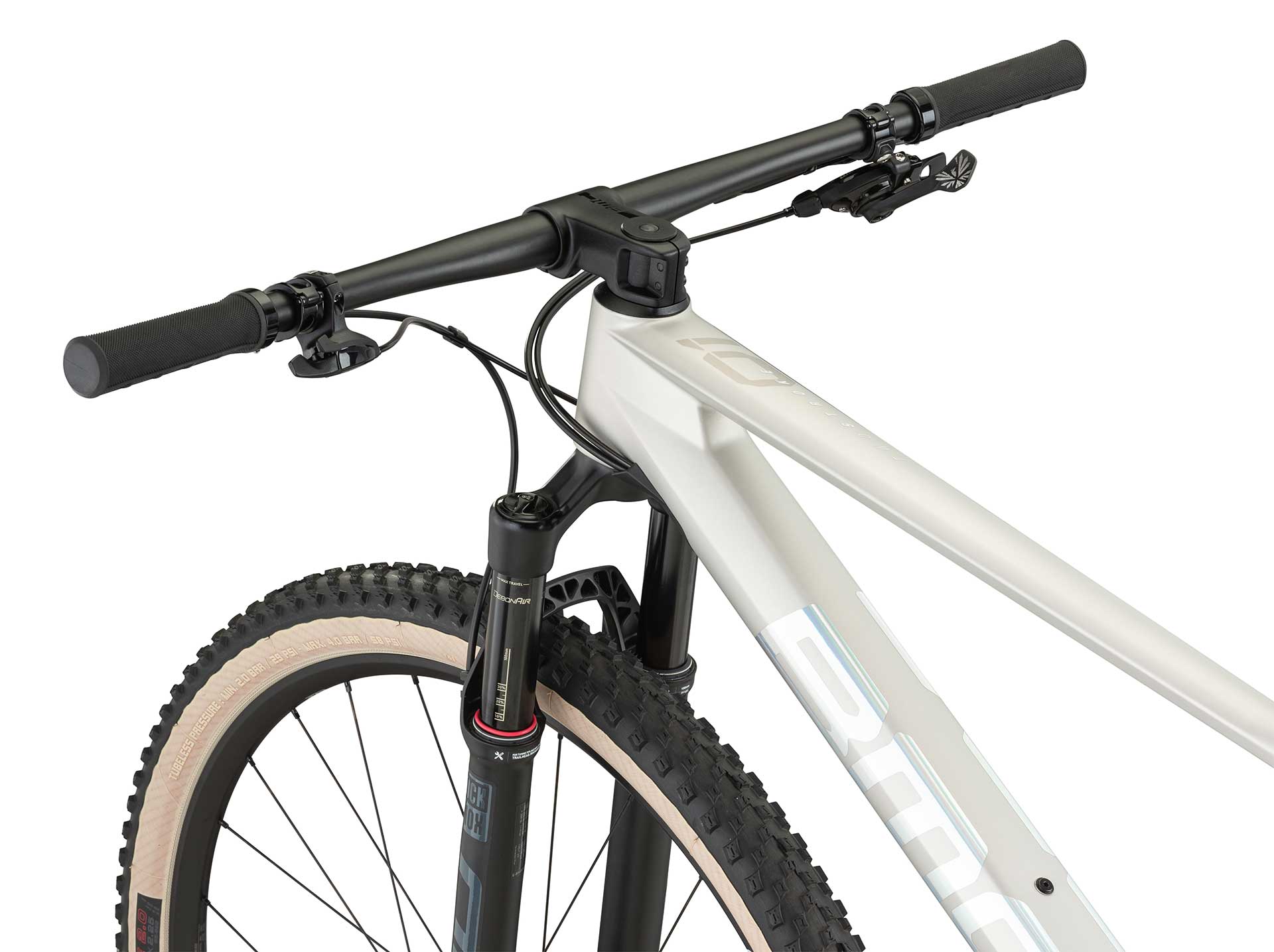 With design cues ‘taken from the Eurofighter’ the new BMC Two-Stroke carbon frame is a hair (37g) over 1000g, in medium, with paint on. It wanted the bike to be stiff foremost, rather than chasing a sub-kilo frame weight. It features a sleek and low frame design – with full internal routing and a very low, bespoke stem that has anti-rotation features to stop the fork crown clouting the downtube. Unlike the top end Four-Stroke, the BMC Two-Stroke hardtail doesn’t have an integrated dropper post, instead using a D-shaped seatpost that is designed to flex for comfort. There is an adaptor that will allow a 27.2mm dropper to be run.