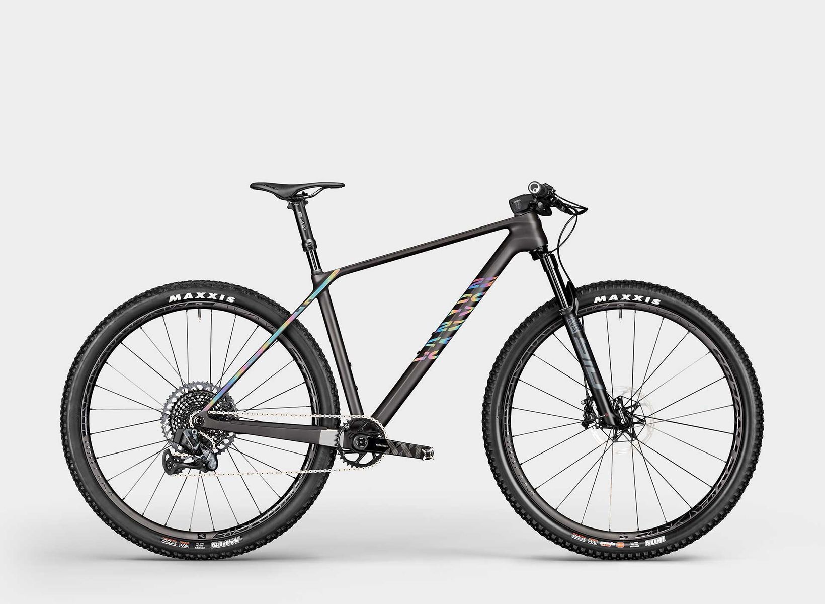 Featuring bold rainbow decals and ‘unicorn hair’ carbon fibre, the new 2021 Canyon Exceed has been engineered to be one of the lightest mountain bike hardtails on the planet. The Canyon Exceed CFR (Canyon Factory Racing) frame is quoted at an astonishing 835g. And that INCLUDES chainstay protector, chainsuck plate, seatpost clamp and (universal) derailleur hanger – in a size medium (a raw frame is 740g…). Even in less pricy mode, with more standard carbon layup and filament, the SLX frame weighs 1015g and the CF weight is 1312g.