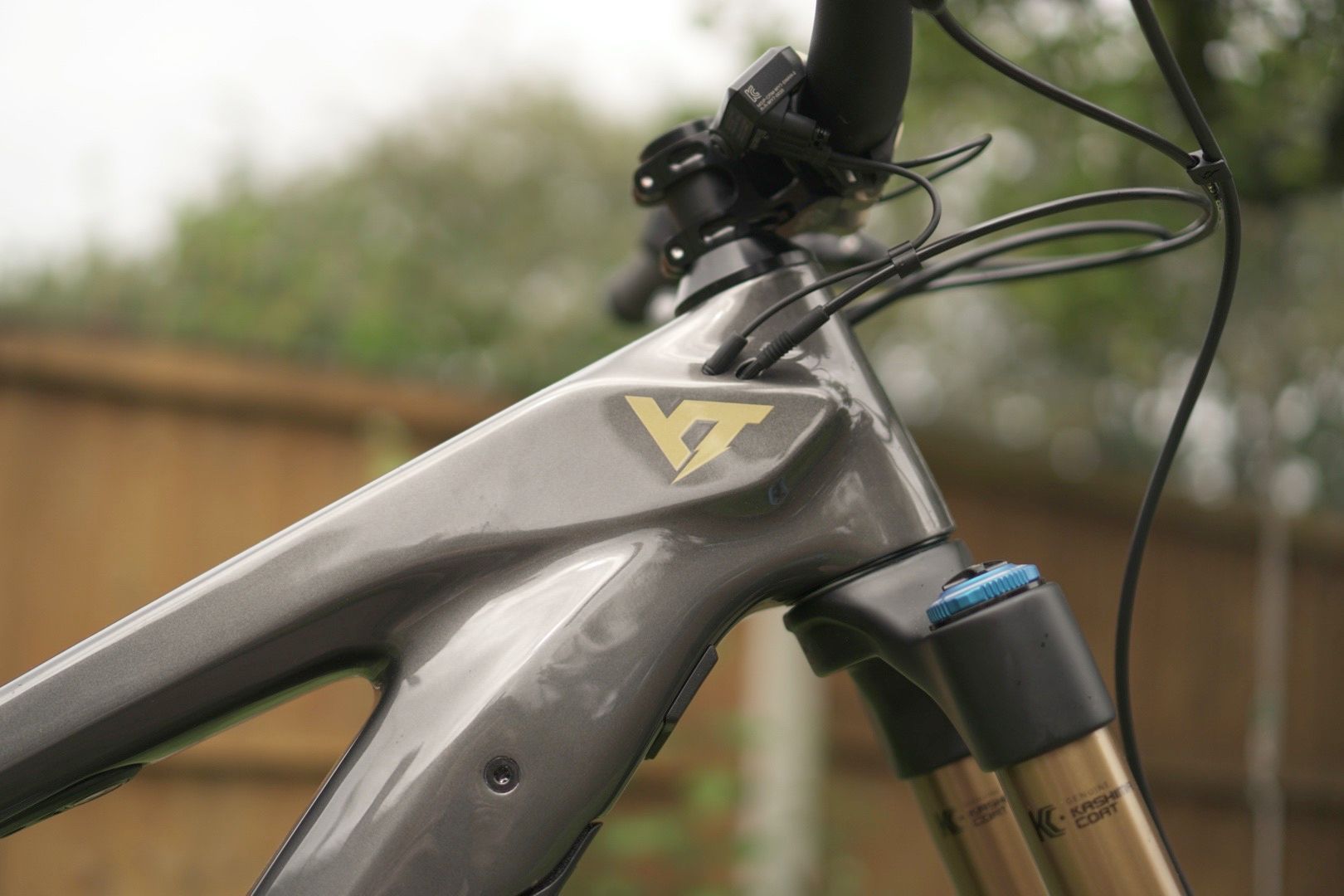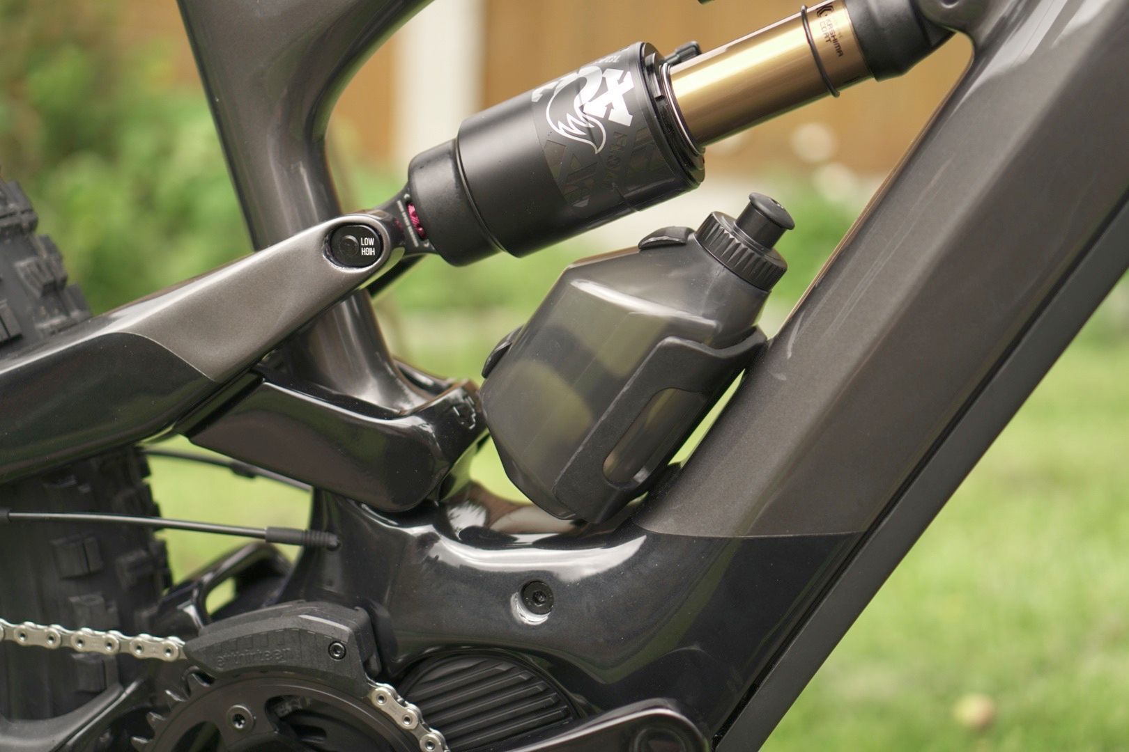 Looks like YT tried so hard to fit a bottle cage that they had to design their own bottle to fit it – or is that just a repurposed 2-stroke mixing bottle?
