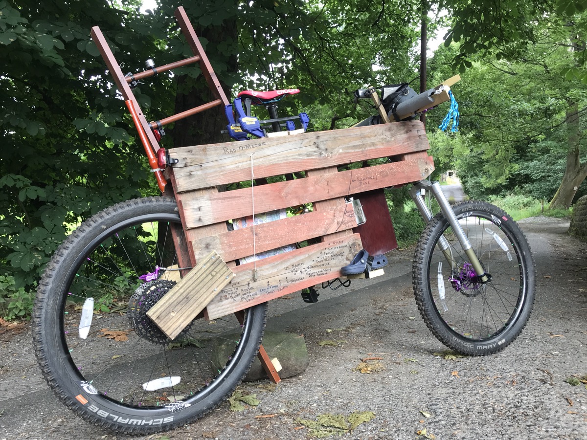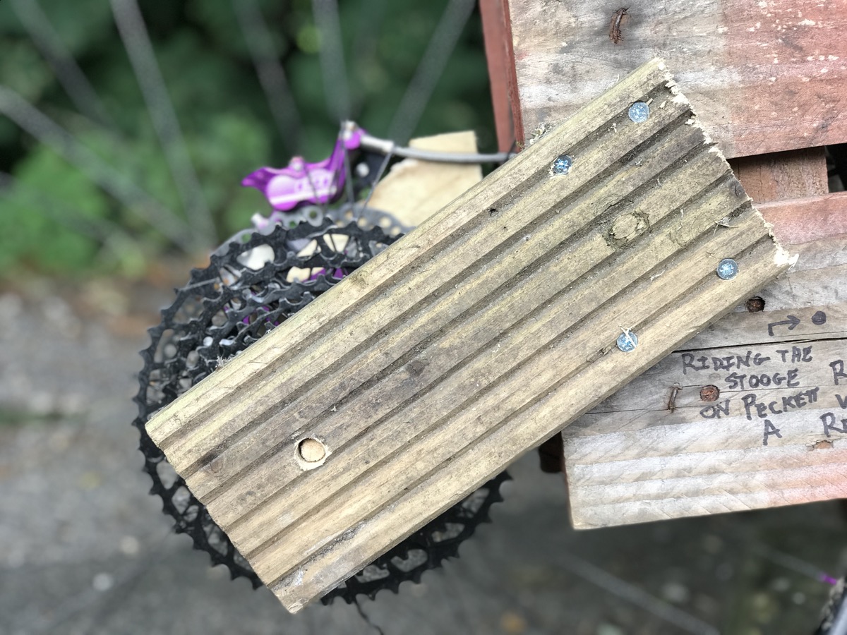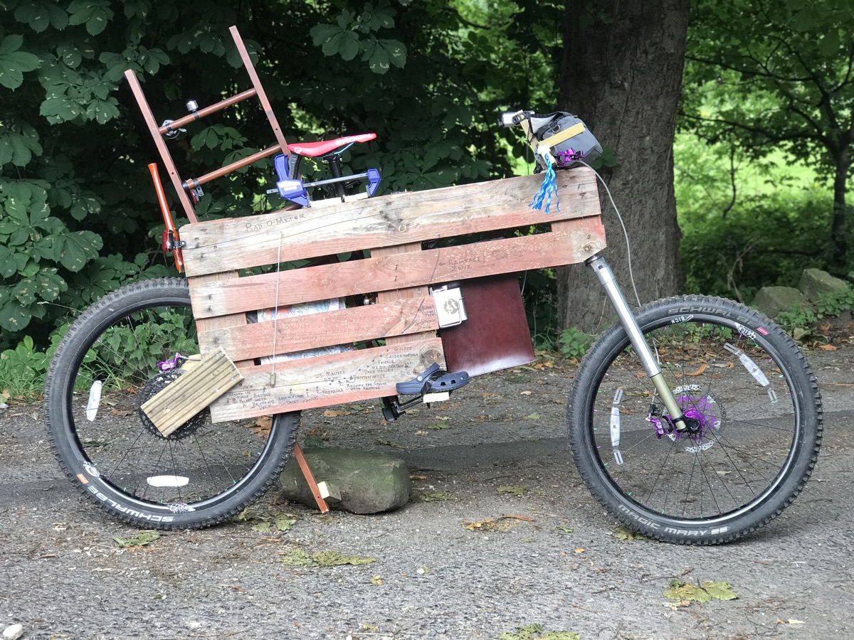 We opted for a strong and stable frame made from a single pallet, with the addition of asymmetrical chainstays made from offcuts of decking. The headtube was cut from a block of scrap wood using a combination of jigsaw, drill, anger, and blunt hand rasp. It took most of a day to cut the two holes necessary to accommodate the fork. Given the quarantine measures under which this was constructed, there was, regrettably, no option to obtain better tools. The ladder/kickstand/seat/push bar thankfully came preformed from the loft, with no additional tooling or machining required.