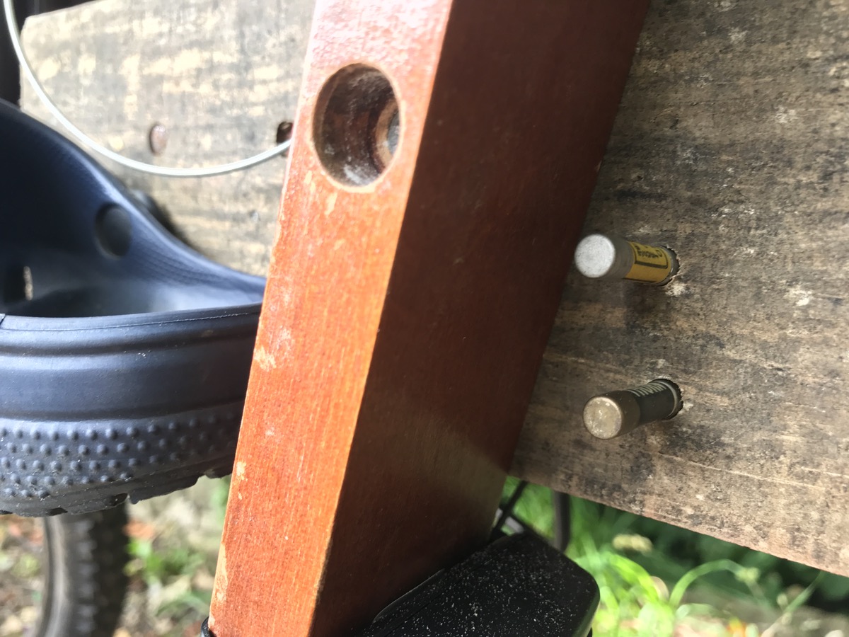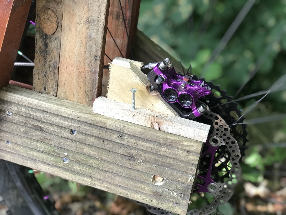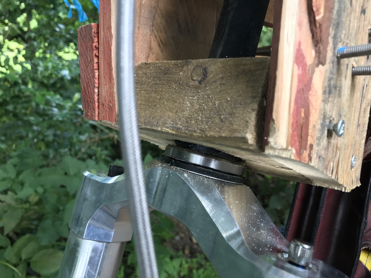 We opted for a strong and stable frame made from a single pallet, with the addition of asymmetrical chainstays made from offcuts of decking. The headtube was cut from a block of scrap wood using a combination of jigsaw, drill, anger, and blunt hand rasp. It took most of a day to cut the two holes necessary to accommodate the fork. Given the quarantine measures under which this was constructed, there was, regrettably, no option to obtain better tools. The ladder/kickstand/seat/push bar thankfully came preformed from the loft, with no additional tooling or machining required.