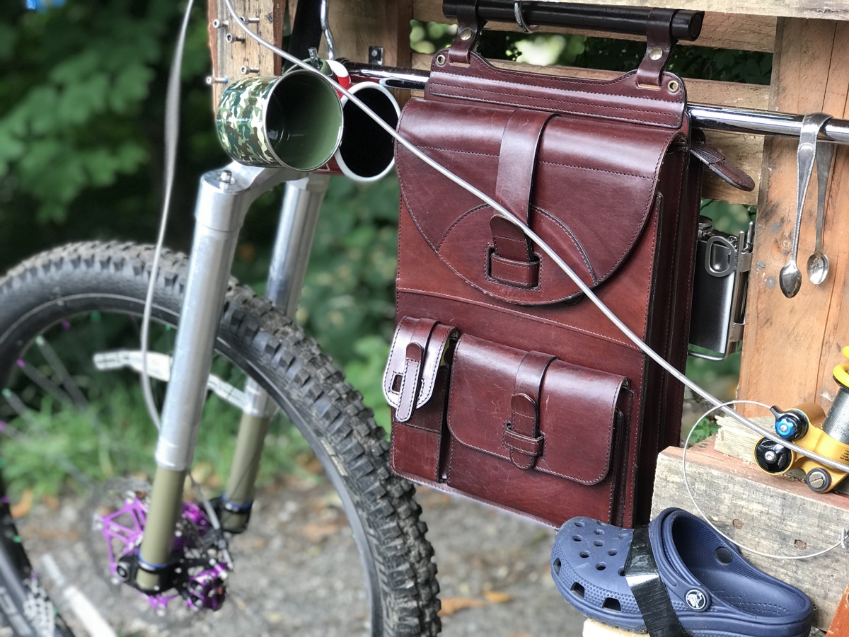 A leather satchel which fits perfectly into the frame void allows the carrying of vital supplies on the bike, or can be detached for foraging forays or hikes further into the downcountry. A hip flask cage and bottle opener provide succour, while the bottle cage mount is handily placed under the bottom bracket. Keeping the weight low helps with the bike’s handling, and while some might say it leaves your water supply vulnerable to poo strike, we say that it’s not bikepacking without a dose of e-coli. To the rear of the bike we fitted a useful recorder mount. If you find yourself alone and far from home, you will soon be able to make new friends or overcome any language barrier through the medium of music.