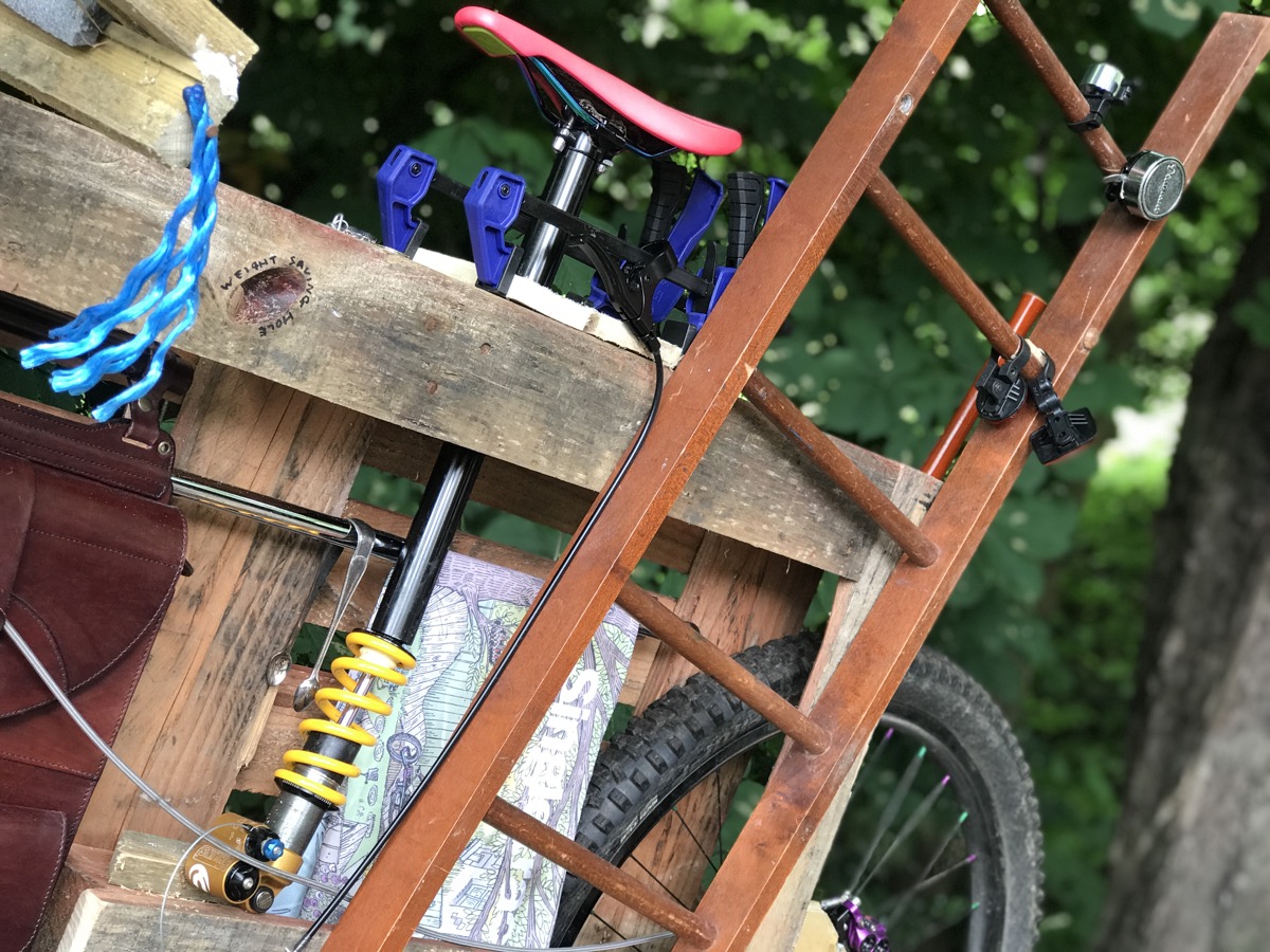 With the Diversion Diaries concluded and partner BK (aka Fahzure Freeride) safely quarantined at home with me, I found myself with time on my hands and plenty of wood. A plan was formed: we would participate in NASLBS, with our own home crafted entry. It would be the pinnacle of bike design, setting a template for the future of the bike industry. Every possible detail would be considered, with the finished product a bike that would be a true quiver killer: from bike park to bike packing, whether down country, back country or alt country, there would be a design feature to improve your ride experience. Come with us now and check out the result.