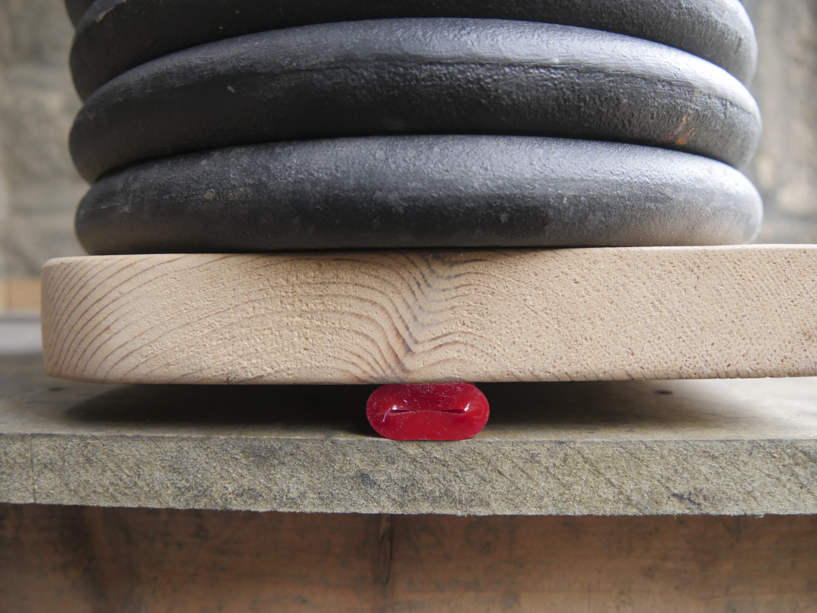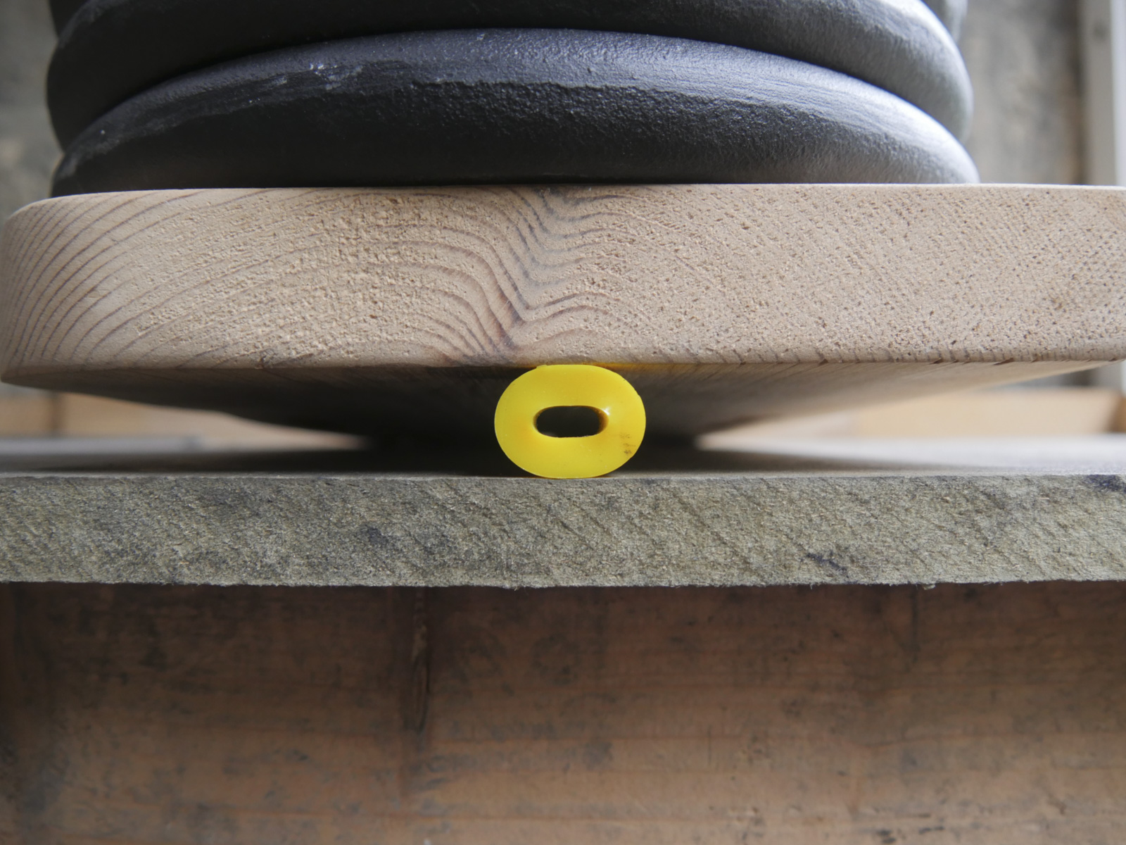 My test was to measure the hole in the centre of each elastomer under no load, then, making sure to orient them the same way, load them up under the end of the plank with 5, 10 15 and 20Kg of weight, measuring the hole at each step. Here are the results: