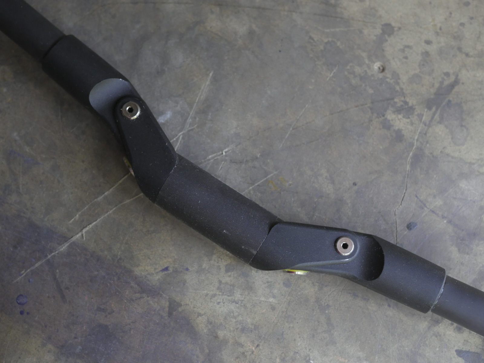 The bars work via four elastomer inserts, two per side, which change the feel of both pushing down (compression) and pulling up on the bars (rebound). They secure by means of barrel bolts, the bolt going in the top through the main elastomer, the barrel holding the washer-like rebound elastomer underneath.