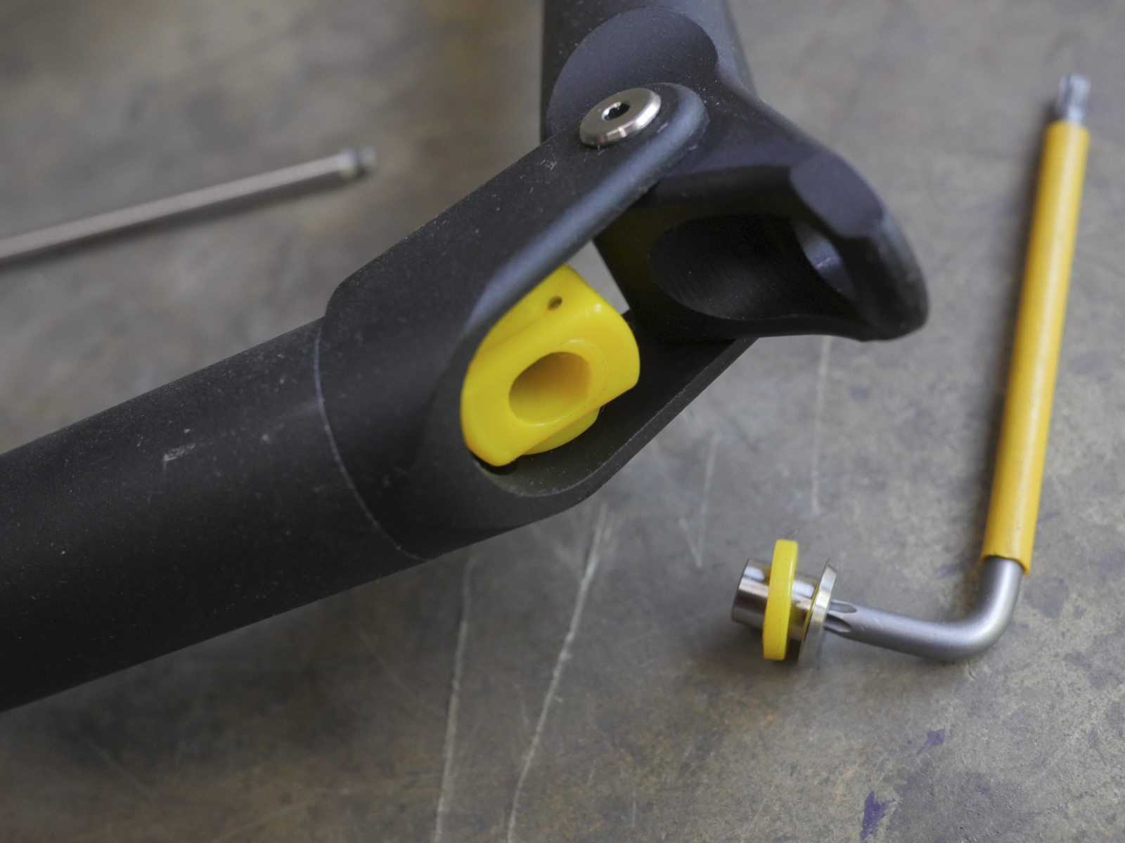 The two compression elastomers are the largest. Once the barrel bolts are undone and removed, each side of the handlebars hinges upward, kind of like a break-action firearm. Changing inserts is quite straightforward, though can require some downward pressure to get the barrel aligned.
