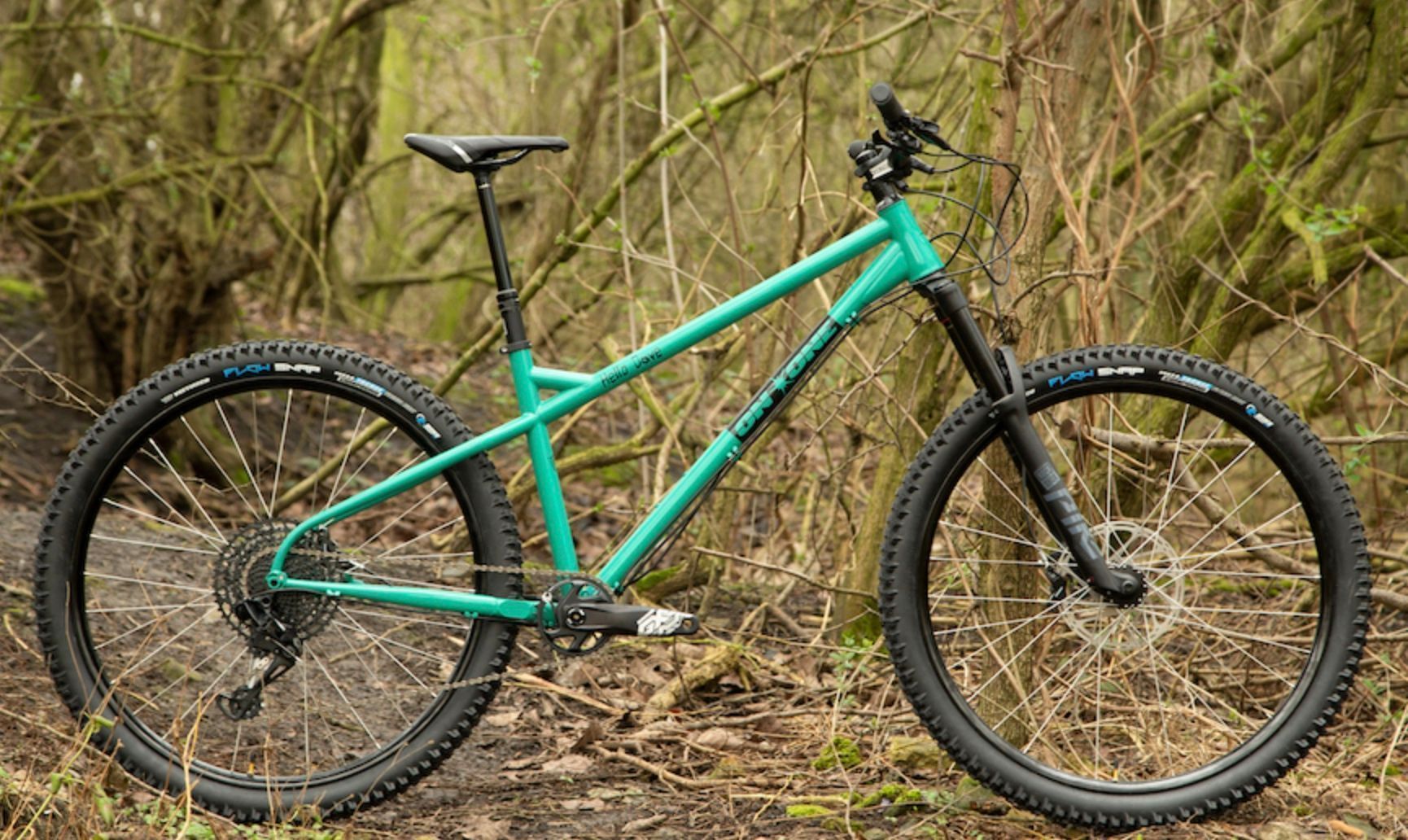 The On One Hello Dave is for riders who want to test out some really crazy geo without spending a fortune. At £349 for the frame only, it’s by far the most aggressive hardtail at this price by a large margin, and even bikes from Pole don’t match the geo. It’s not going to be a bike that suits everyone, but if you already have a taste for ultra-long and slack then the Hello Dave is a cheap hardtail option. The numbers? 62-degree head angle, 77-degree seat tube, and reach from 450-520mm!