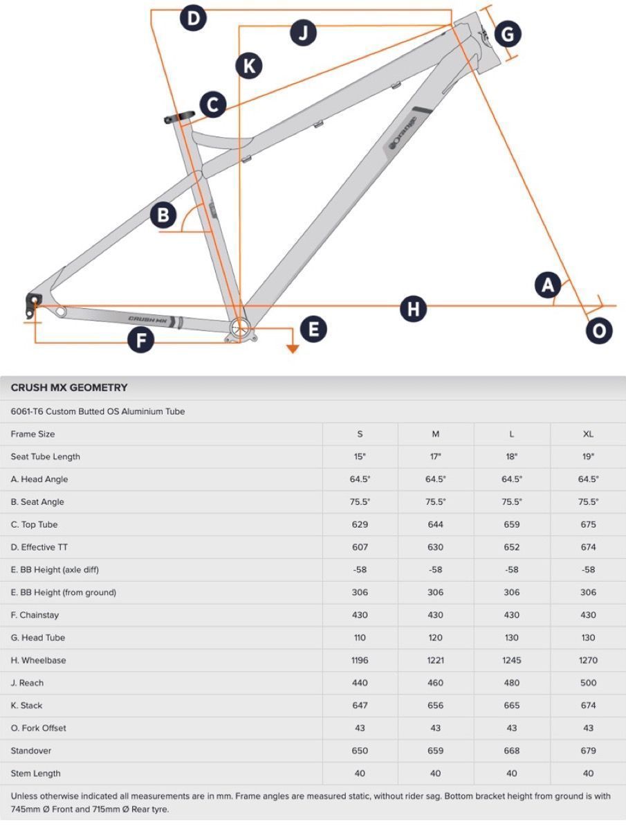 The Orange Bikes range of hardtails currently includes the Crush and the P7, both available in 27.5in and 29in wheel sizes. To the mix is added the Crush MX – a 140mm hardtail with 29in wheel up front and a 27.5in wheel at the back. We’re a bit sad it’s not called the Bucks Fizz.