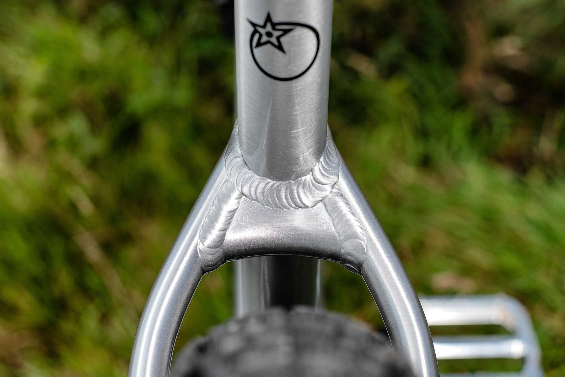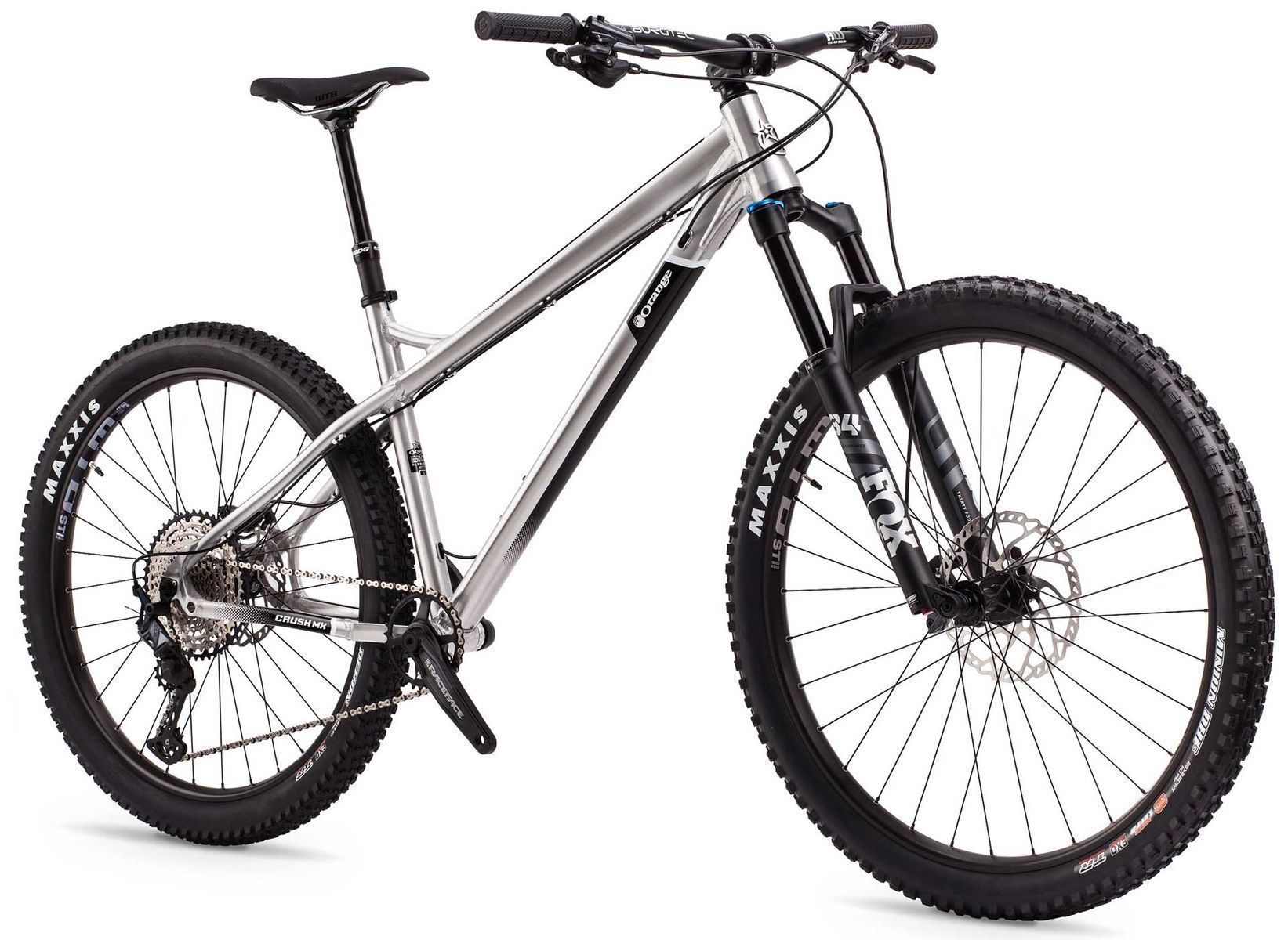 The Orange Bikes range of hardtails currently includes the Crush and the P7, both available in 27.5in and 29in wheel sizes. To the mix is added the Crush MX – a 140mm hardtail with 29in wheel up front and a 27.5in wheel at the back. We’re a bit sad it’s not called the Bucks Fizz.