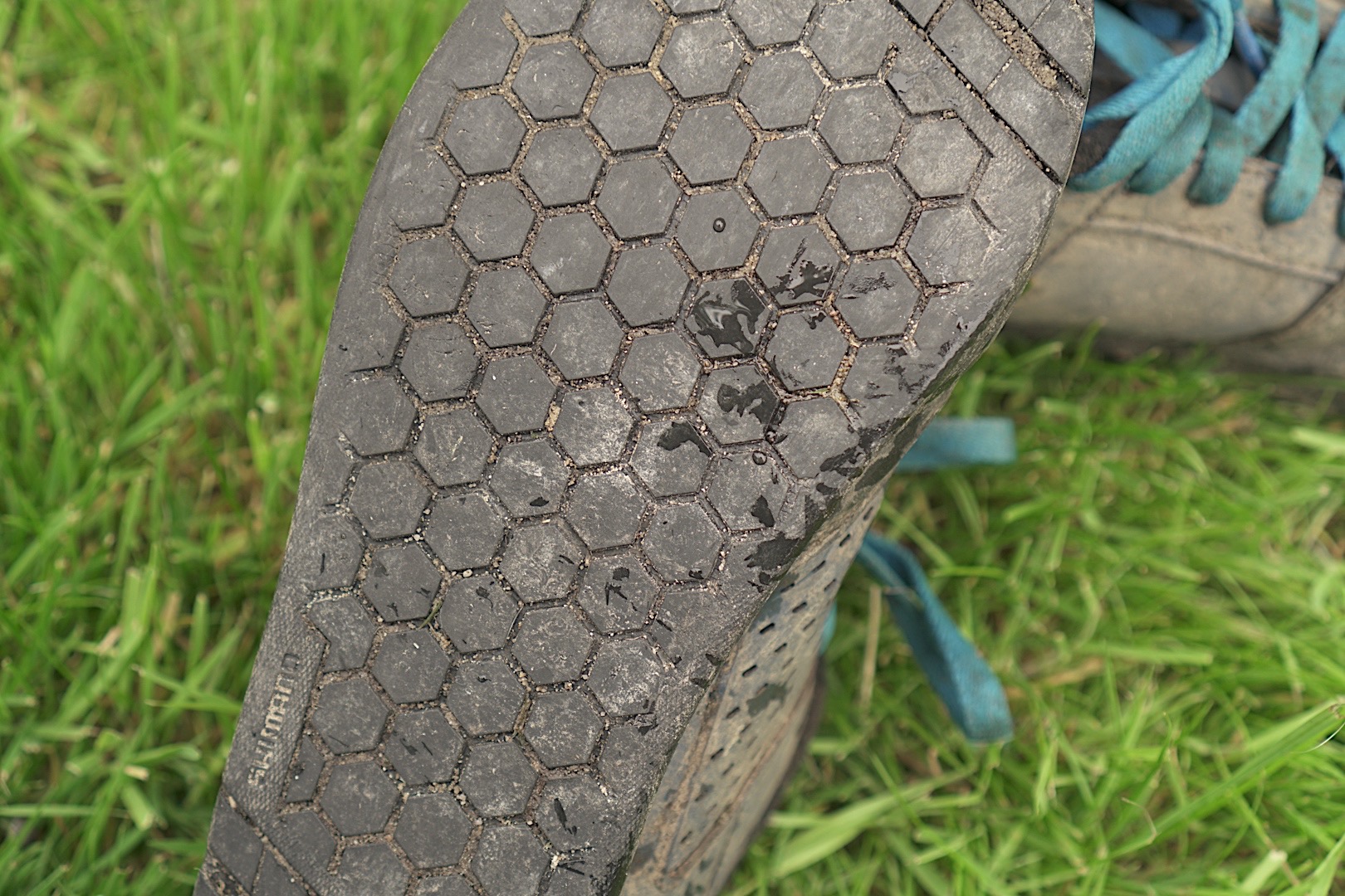 The sole is made of Shimano’s own rubber compound with two distinct tread areas. The central area for the pedal is very flat with a shallow hexagonal pattern. Each hexagon is around twice the size of the pattern found on a Five Ten or Ride Concept sole, but the spacing is wide enough for pins to wedge in and offer traction.