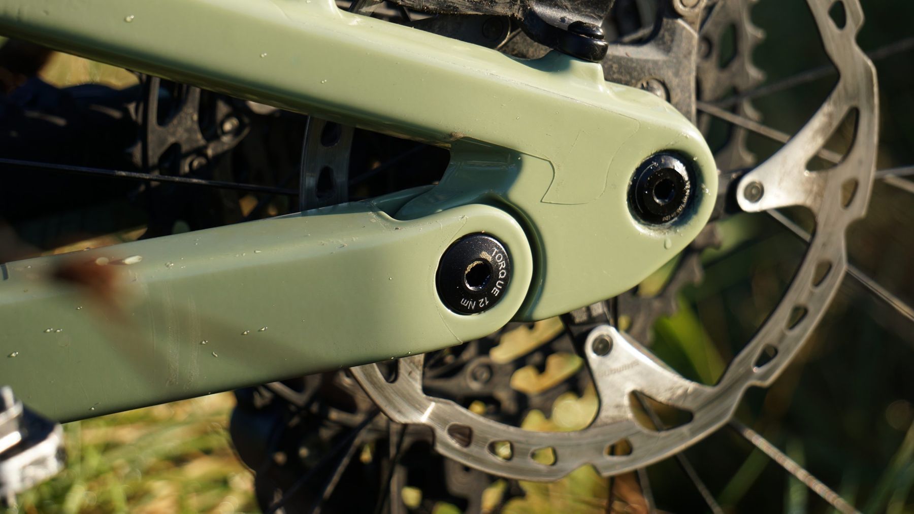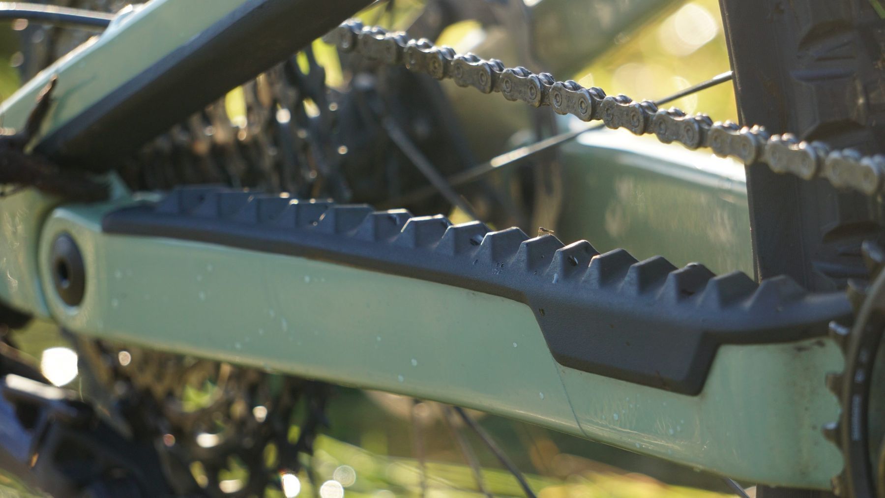 Under the downtube / BB area you’ll find a custom moulded frame protector to ward off rock strikes. Along the drive side chainstay is a moulded, castellated, protector to protect from chain slap and keep things nice and quiet.
