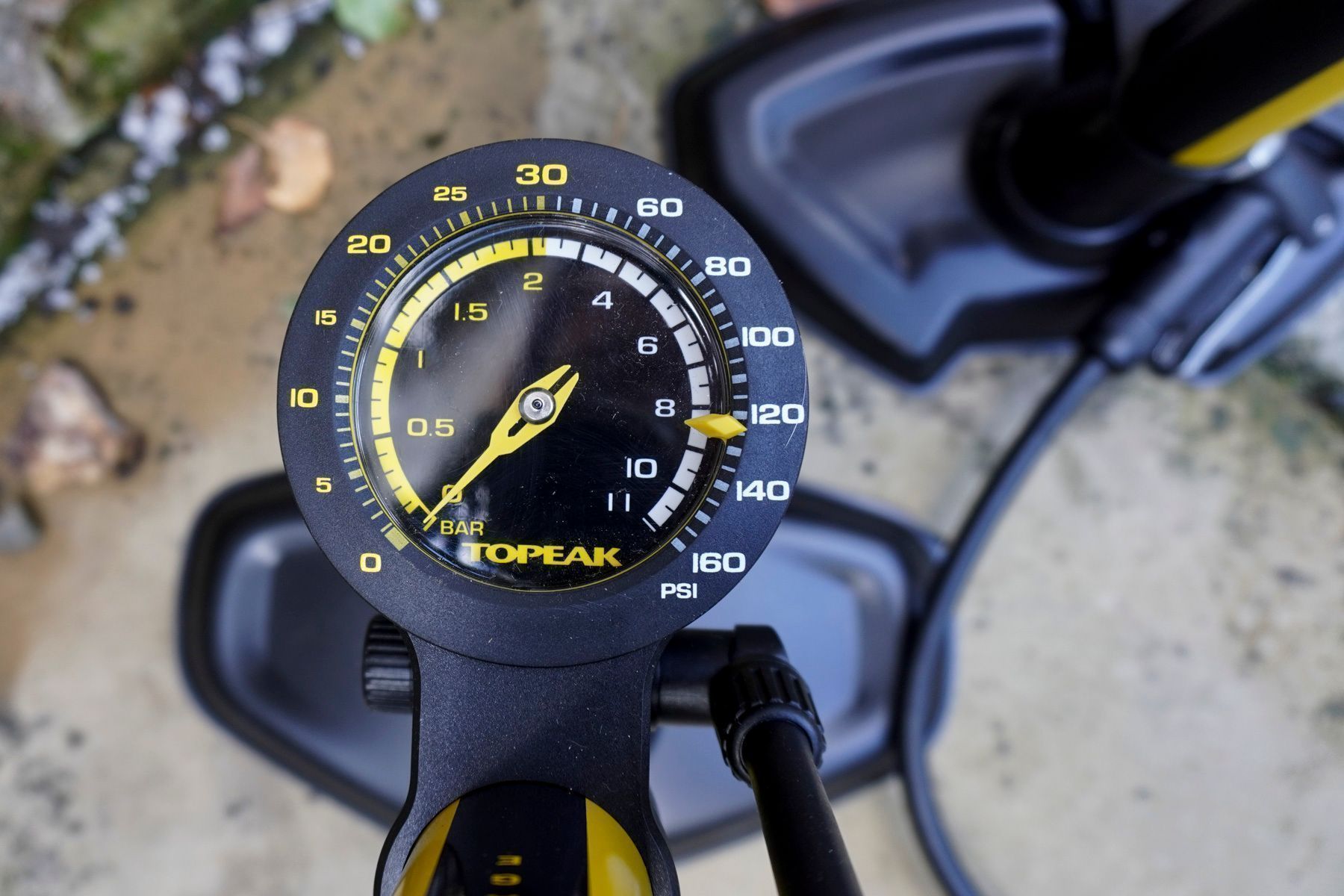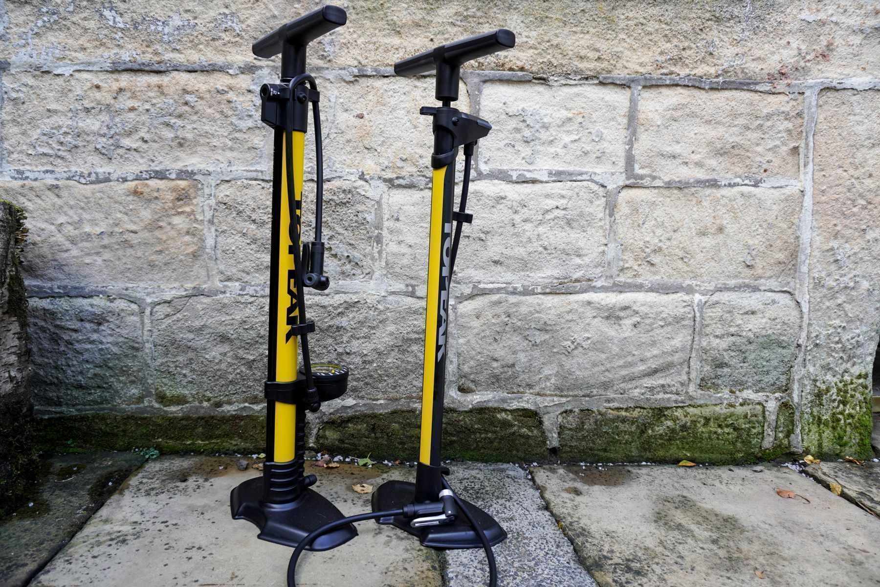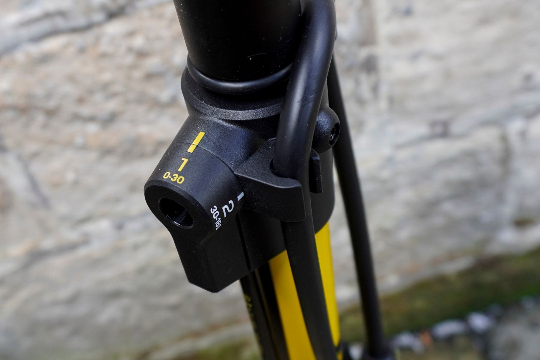 Here we have two pumps from the venerable Joe Blow range of floor pumps. The first is the Joe Blow 2Stage, which is good for those riders with multiple bikes. There’s a quick inflation ratio up to 30psi, ideal for any mountain bike use, then you can flip the mechanical switch and access the high pressure side of the pump which will take you up to road bike pressures.