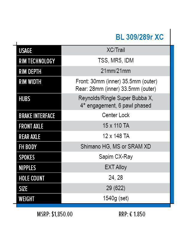 Reynolds today introduces a new range of XC wheels, the 309/289XC. These carbon wheels are aimed at the demands of modern XC racing, and come in four build levels to suit a range of pockets, from $1299.99 to $2099.99. The top priced limited-edition version comes with a Super Bubba X turquoise hub set from sister company Ringlé. All levels in the range have new front and rear-specific rim designs and spoke counts.