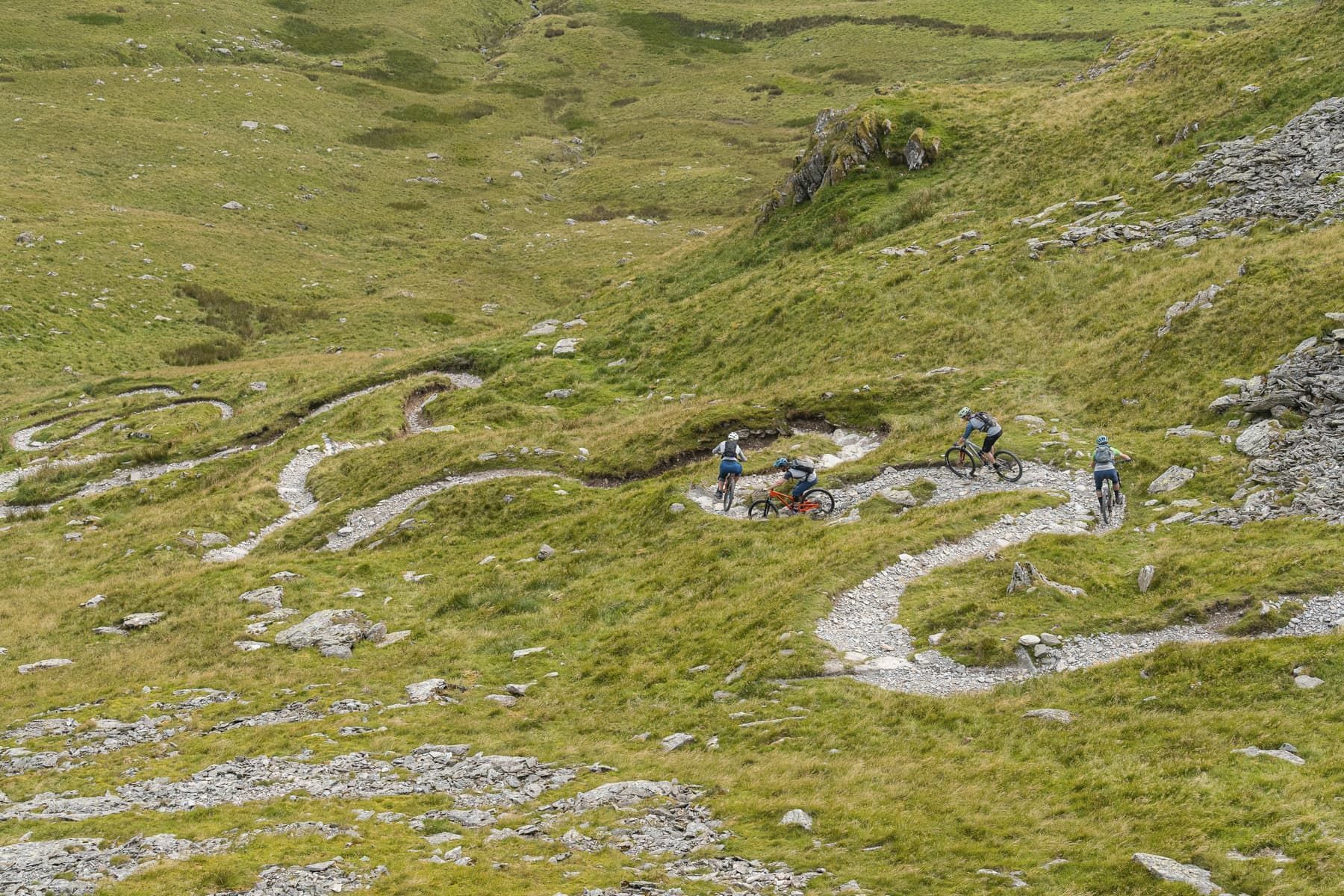 The switchbacks appear midway down the pass as a matched pair, perfectly placed to catch you out after a short straight so you hit them at maximum velocity. Which is precisely the thing you need for control in this section, as the baby head rocks from earlier have given way to what are essentially marbles. The switchbacks are not especially steep, but grip is non-existent and I drift haphazardly round. More skilled riders tackle these with aplomb and make them look effortlessly easy, but it’s all I can do to stay upright. In spite of the best efforts of various trail repair organisations, the lower section of Garburn Pass remains stubborn in its fight against sanitisation, and remains a chunky, bouldery riot.