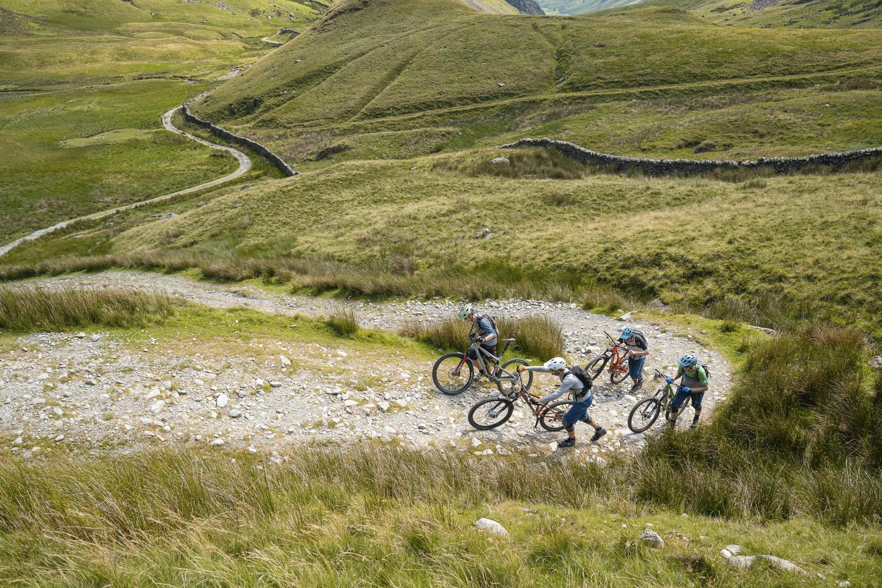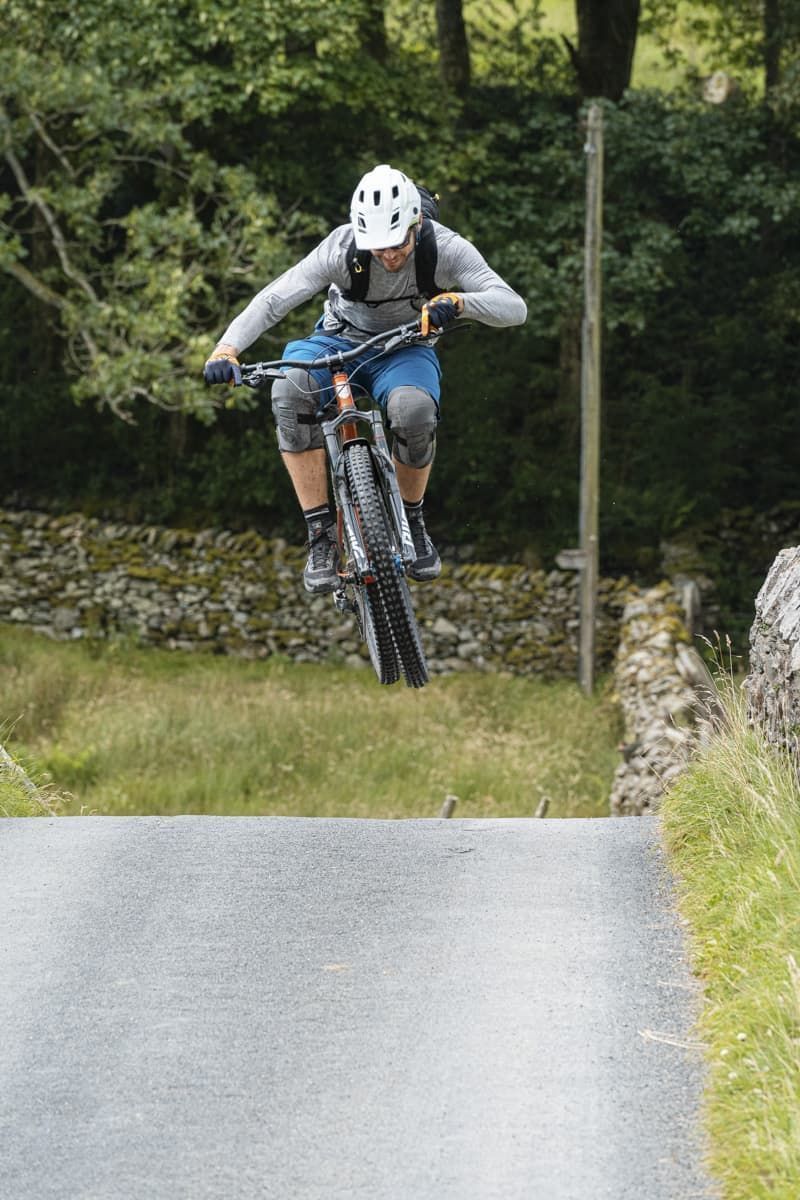 A short road section claws back the worst of the height lost on Garburn while the off-road section to Longsleddale is a touch more gentle, although today my legs are full of Garburn and I’m slowly dropping back. Any suffering is short-lived though, and the farm track heads downhill soon enough. The trail encourages you to pop off the plentiful little features and undulations, bouncing from one rut to the next, until just as you’re getting into the swing of things, a blind, off-camber, cobbled left-handed switchback leaps up out of nowhere to take you down. This is followed by another four switchbacks in close succession, although there is evidence that plenty of riders ignore the corners and cut a straight line down the middle. Please don’t.