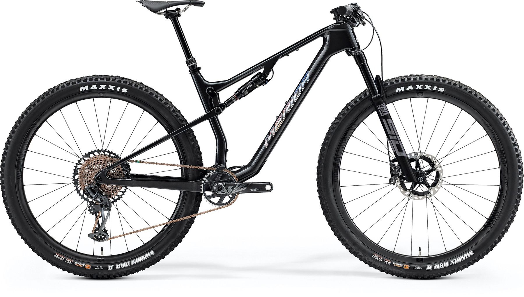 - Sram GX Eagle 1×12 drivetrain – Copper coloured cassette and chain – 10-52 cassette- Carbon crank