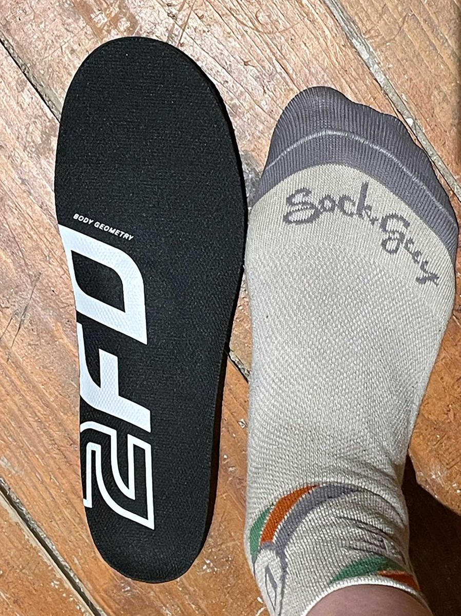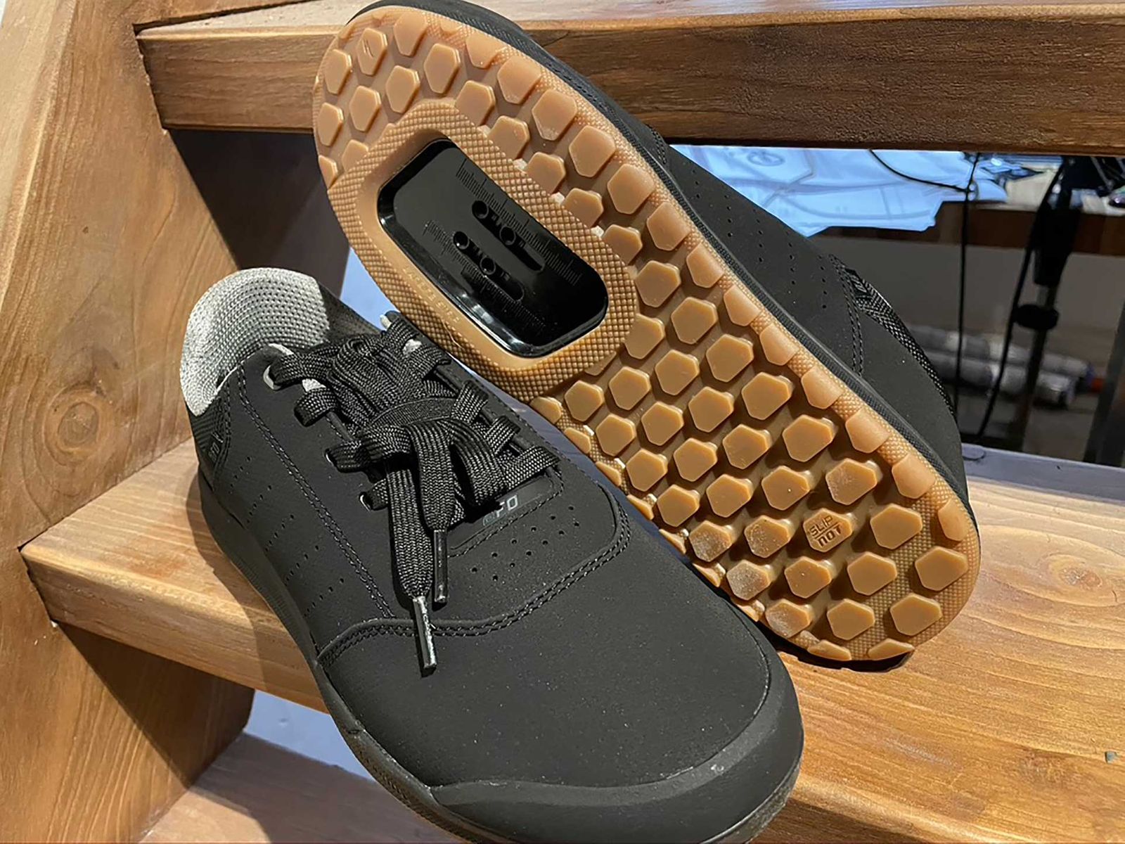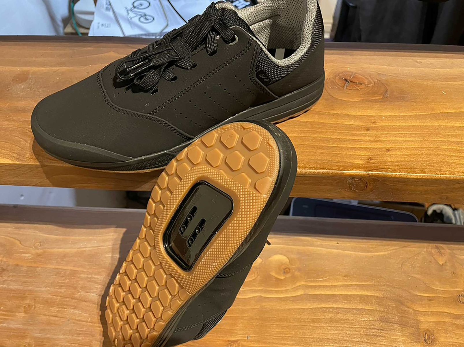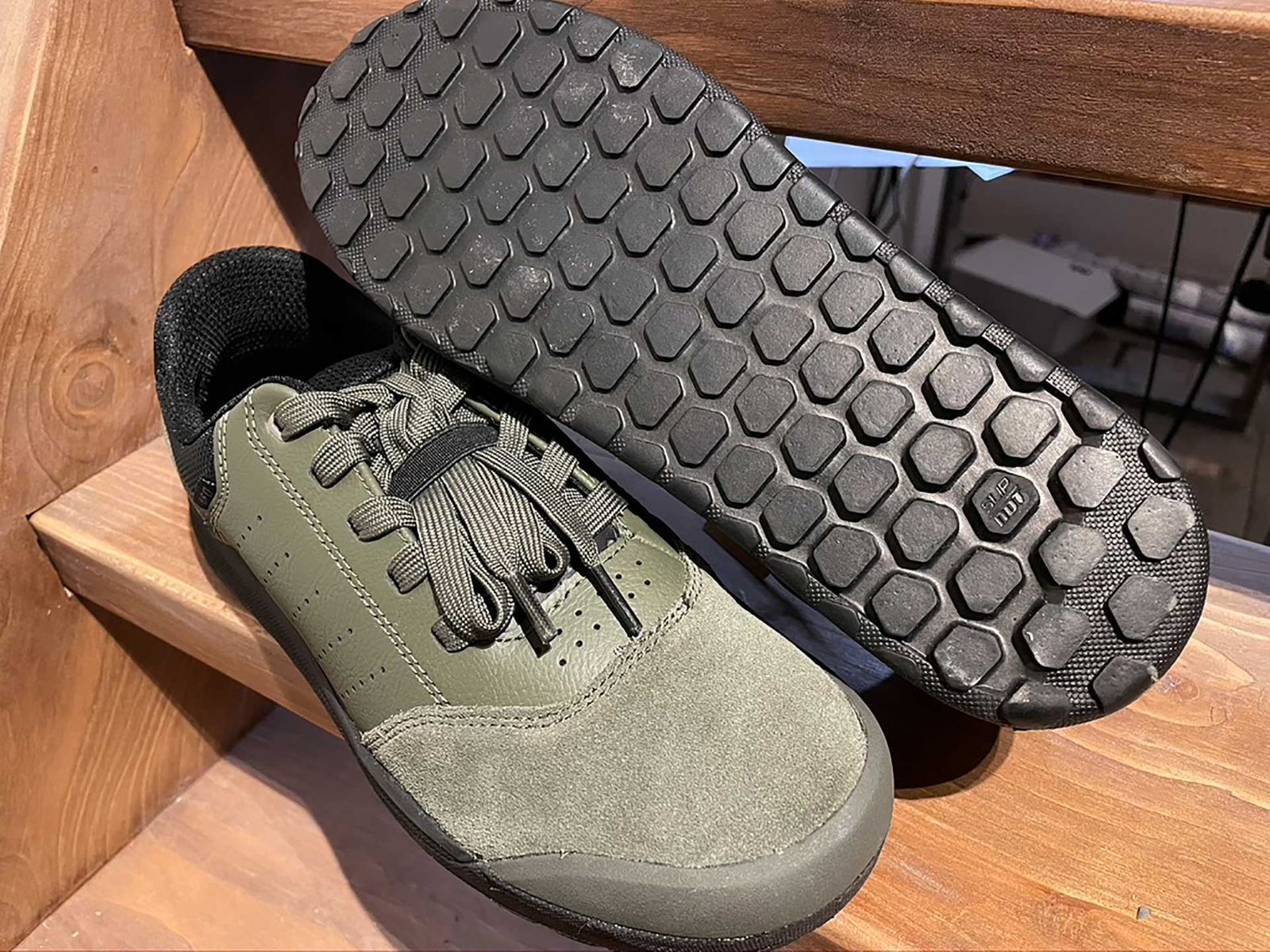 As launched just this week these new smart-casual shoes from Specialized use the new generation of SlipNot sole rubber for a grip that’s reputed to be as good as Five/Ten. We’ve got the SPD and the flat shoes in, so we’ll give them a go, now that grip has disappeared completely out there. Oh, and just for @Onzadog, there are shots of the footbed with a foot for scale. We aim to please.