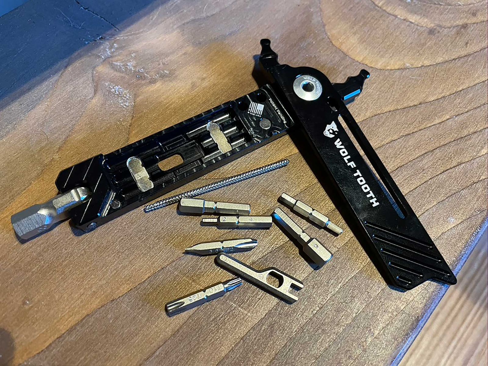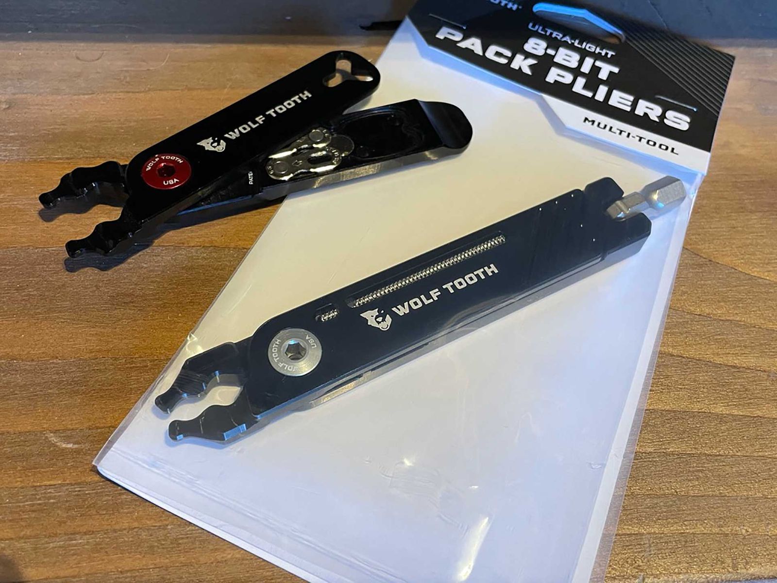 The new Wolf Tooth 8-Bit Pack Pliers is a lightweight multi-tool with 17 functions. Eight attachments nest inside the handles of master link pliers using magnets and a clever storage system. These attachments then fit into an 8mm ball detent swivel head that has a 4mm opening for hex bits. We’re already fans of the Pack Pliers, which are great at joining split links and these come in only slightly larger than those. There’s even a spare chainring bolt as the main pivot.