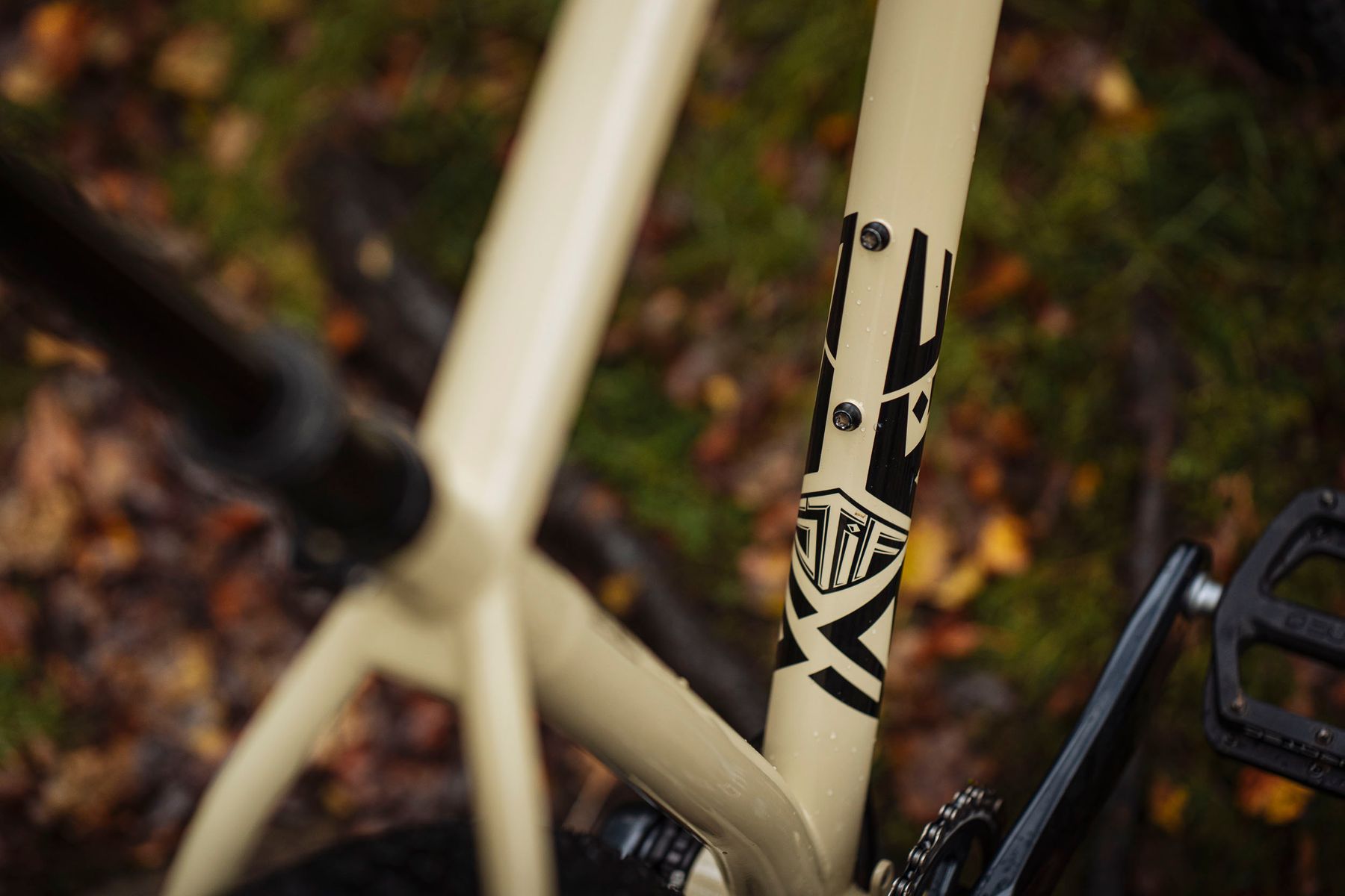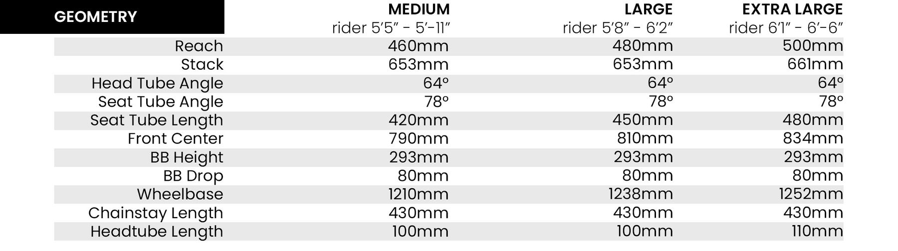 OK, we’ve heard a few numbers, but everyone’s going to be asking about numbers, so here are a few for the Stif Squatch: 64°/78° angles, optimised for a short offset, 130mm fork. There’ll be three sizes: Medium (460mm reach), Large (480mm reach) and Extra Large (500mm reach).