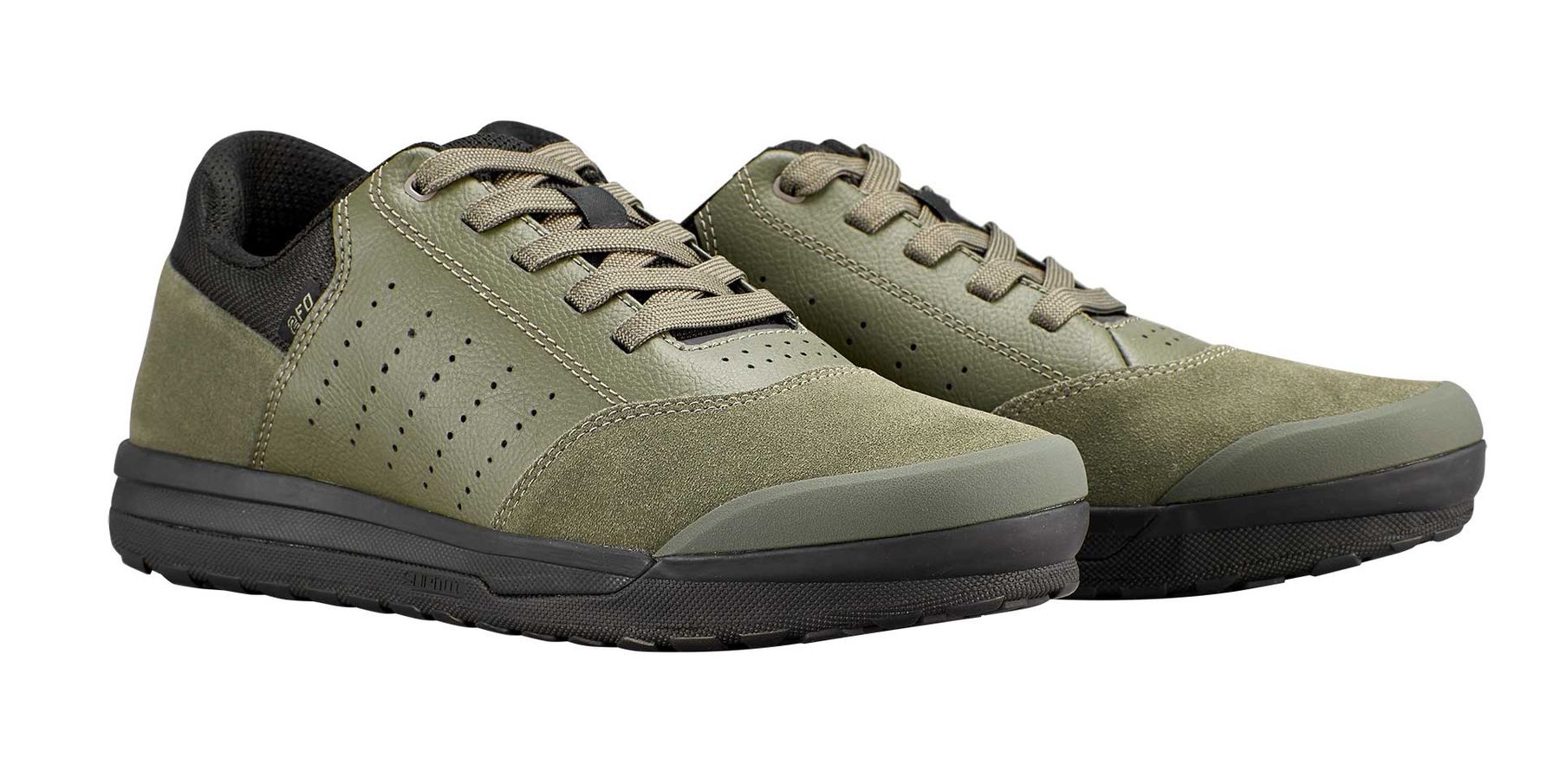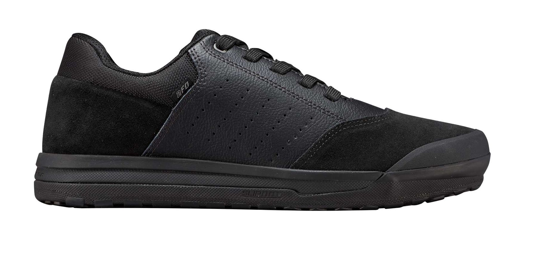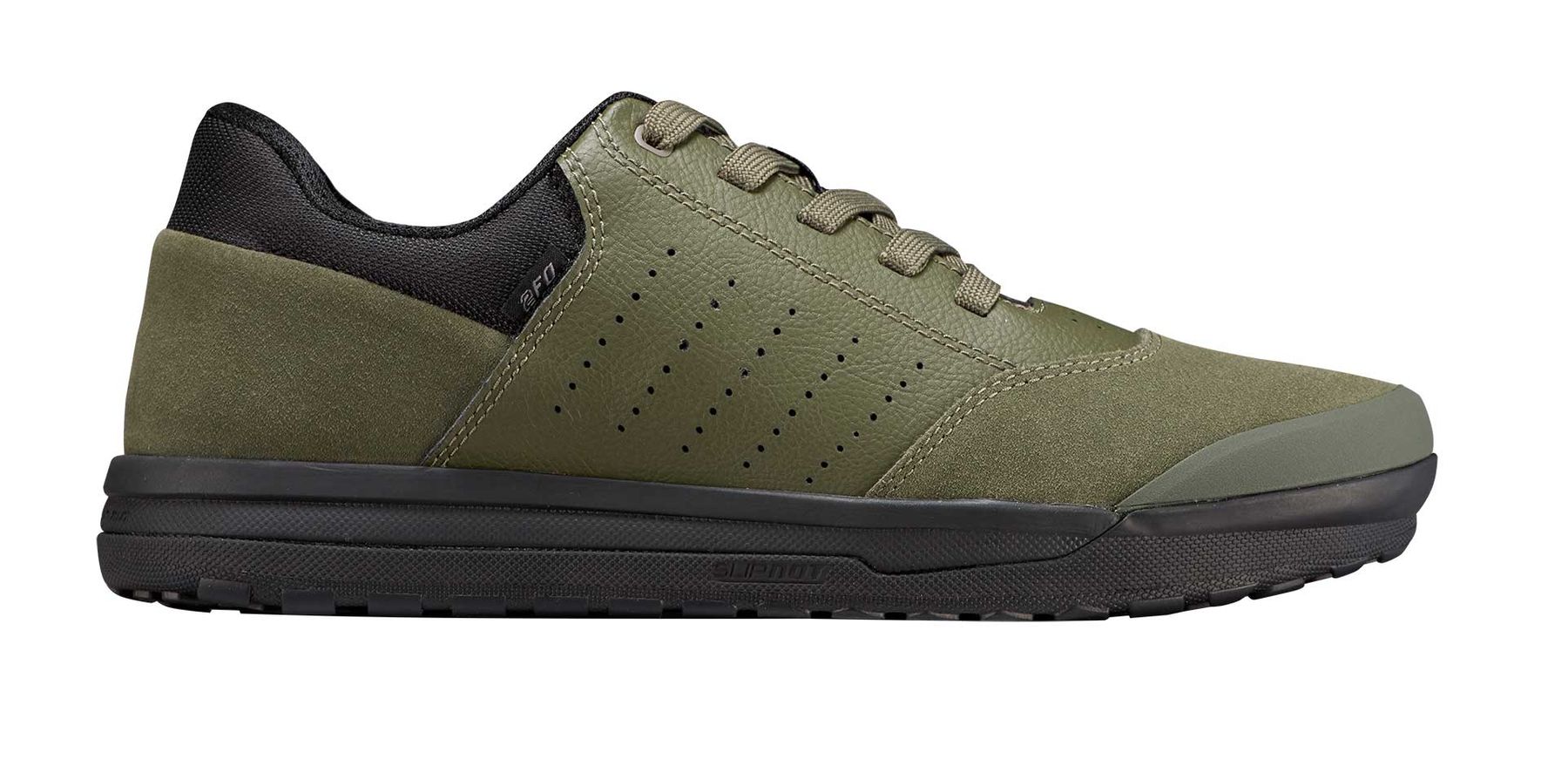 The Roost 2FO flat shoes will come in Oak Green with black or in a Black/Black/None More Black option. Actually the flat pedal shoe has a shiny leather centre instead of the clip-in shoes’ all-matt.