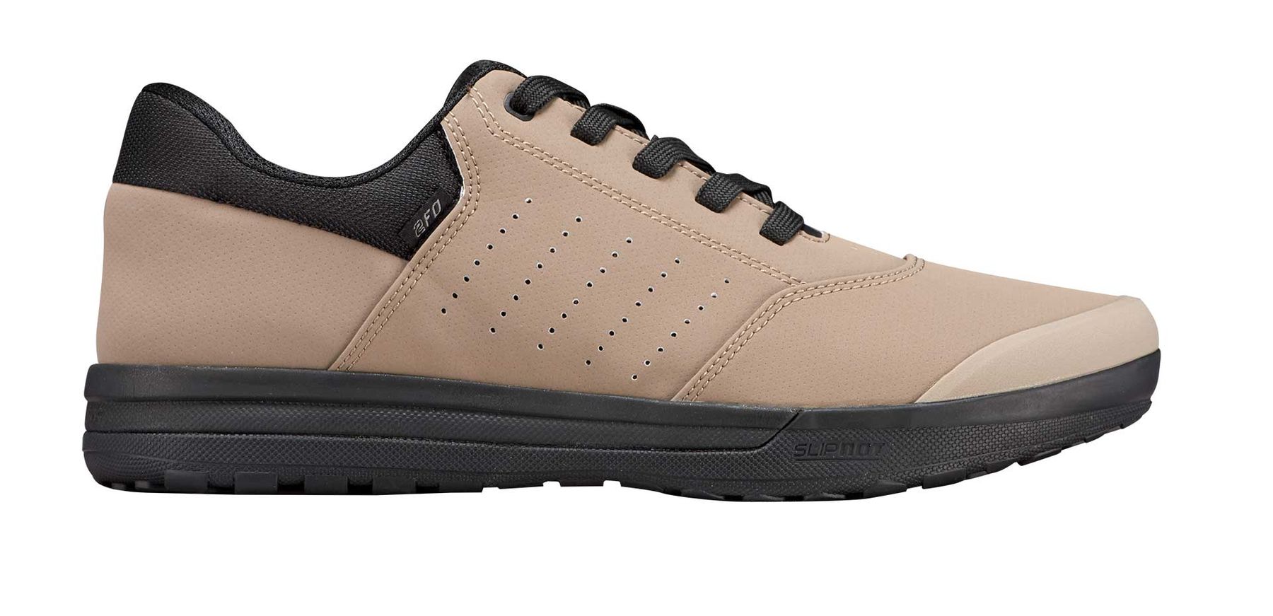 The Roost 2FO clip-in shoes come in black and ‘taupe’ and feature a wide and long cleat pocket that’s a little more rear-biased than a race shoe for a more flat-pedal feel. It features the same SlipNot rubber as you’re not always clipped in, right? They’ll come in sizes 38 – 48 with no half sizes and will cost £110.