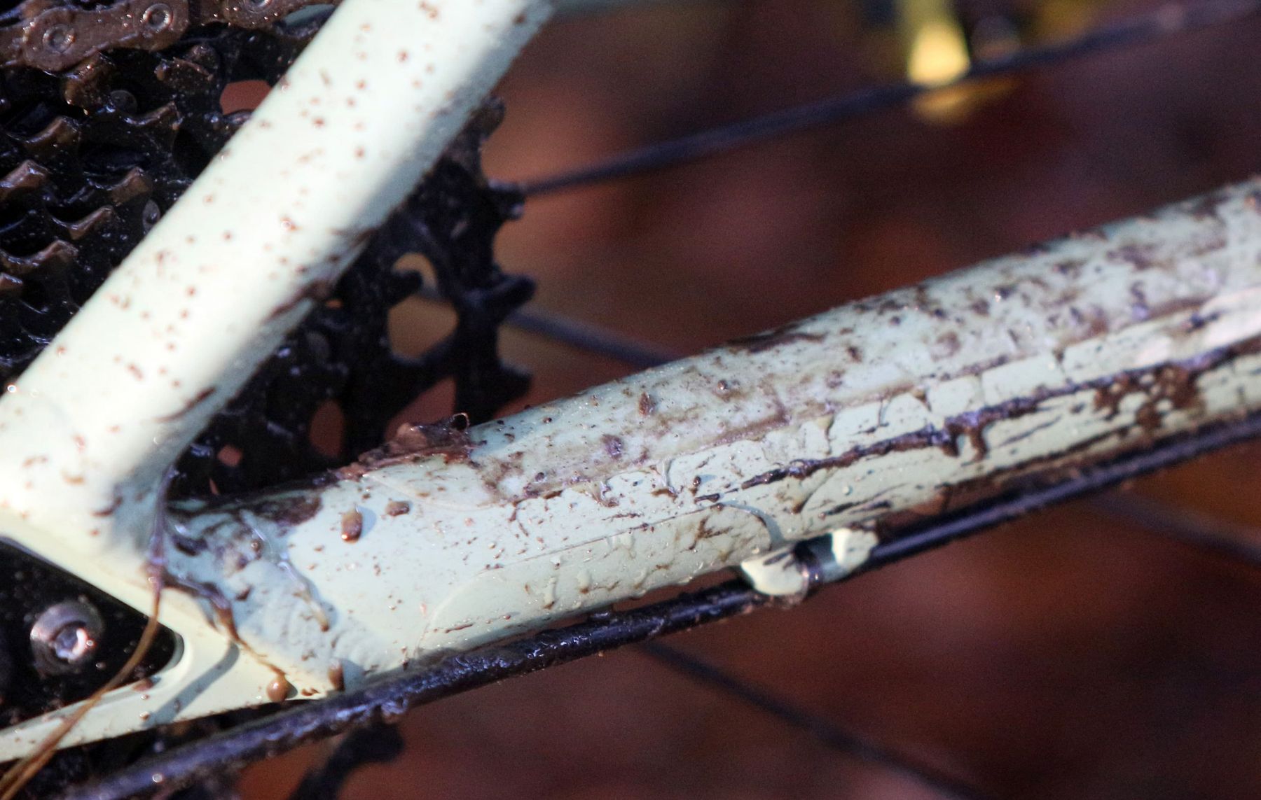 There’s no thick rubber downtube or chainstay protection, so your frame is largely exposed to all the world can throw at it. There is a subtle, clear, frame protection sort of thick sticker on both, and I can’t say I noticed any rattling chain slap, but a quick wrapping of inner tube round the chainstay would likely keep your bike looking fresher for longer. And that’s something I think you might want to do – it’s a good looking bike, and I did manage to chip the paint on the other chainstay – I have absolutely no idea how, as I don’t recall any rock strikes.