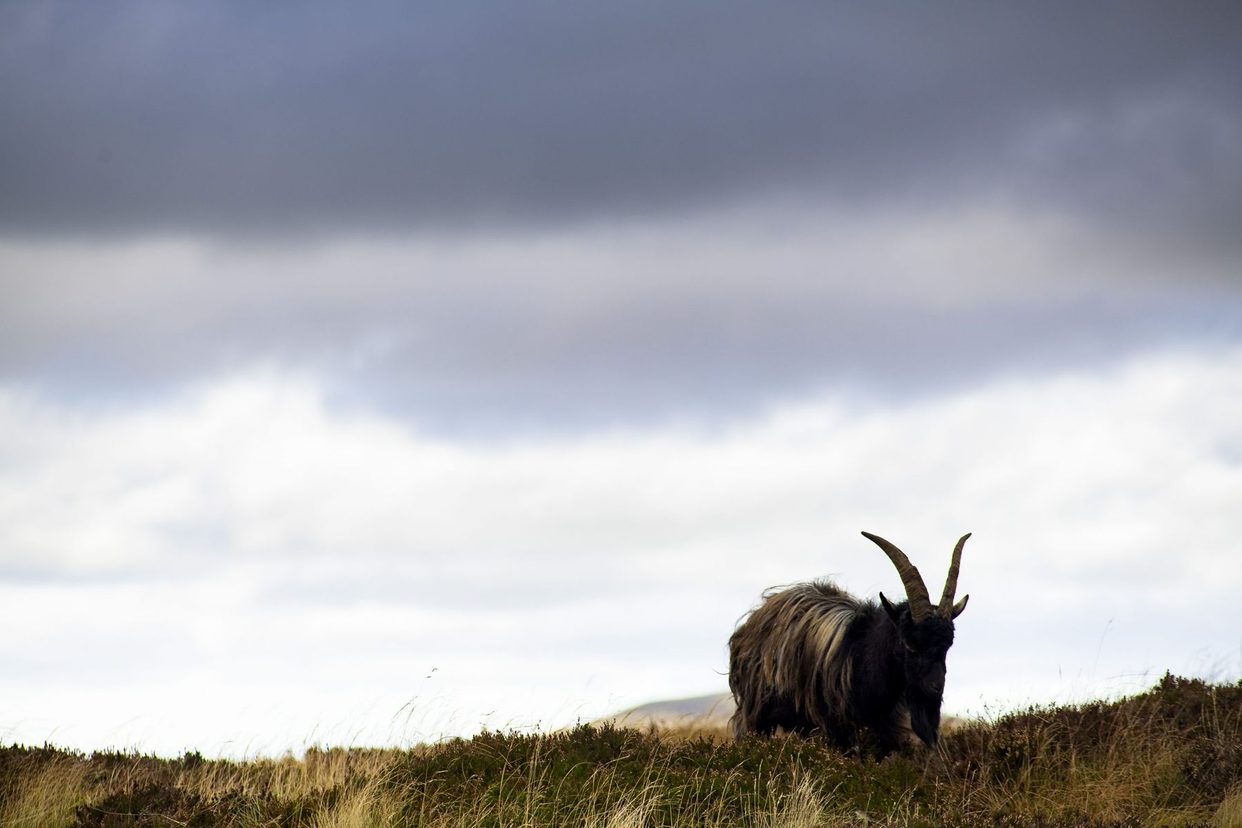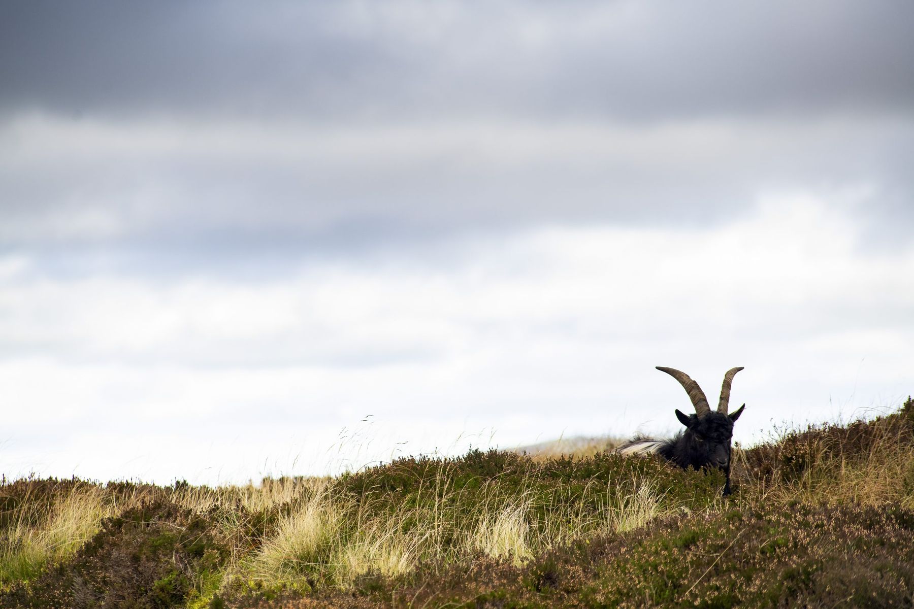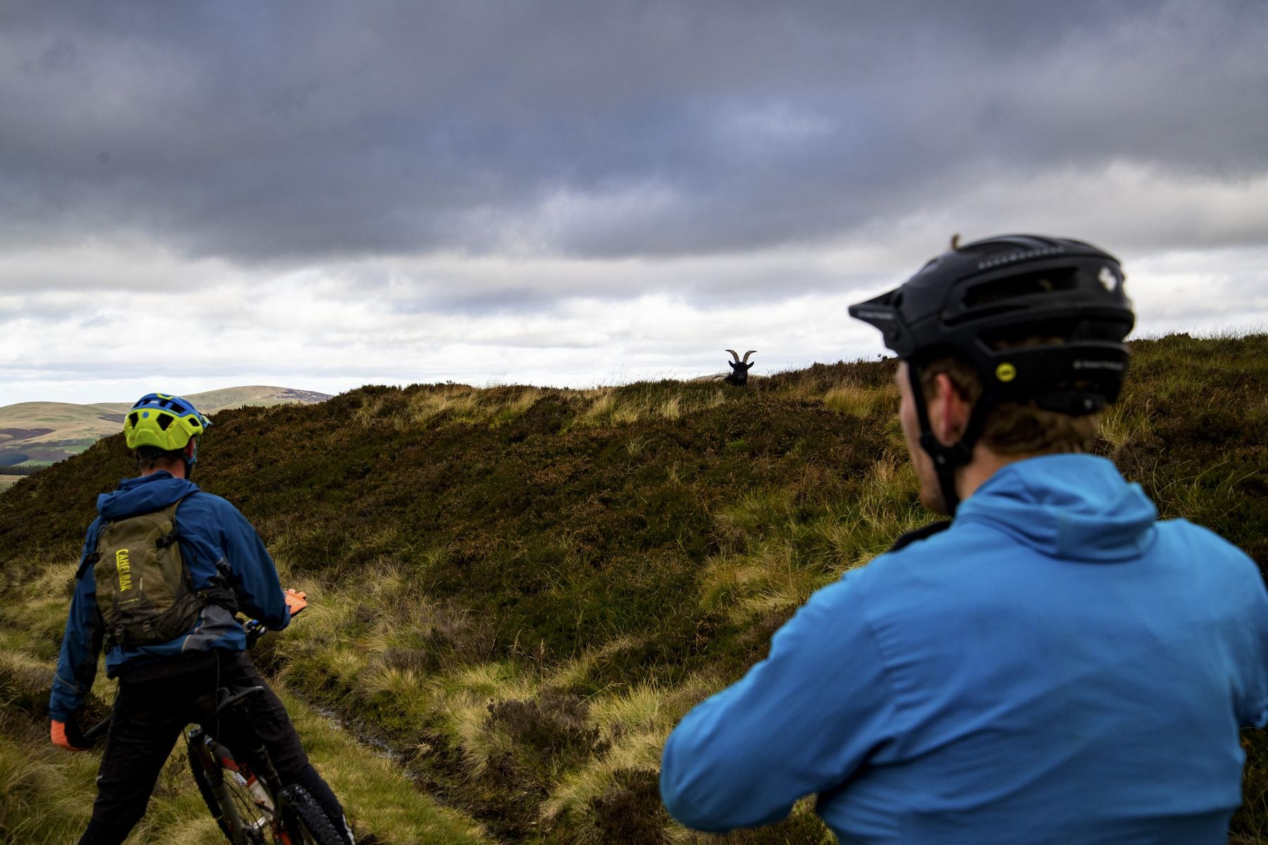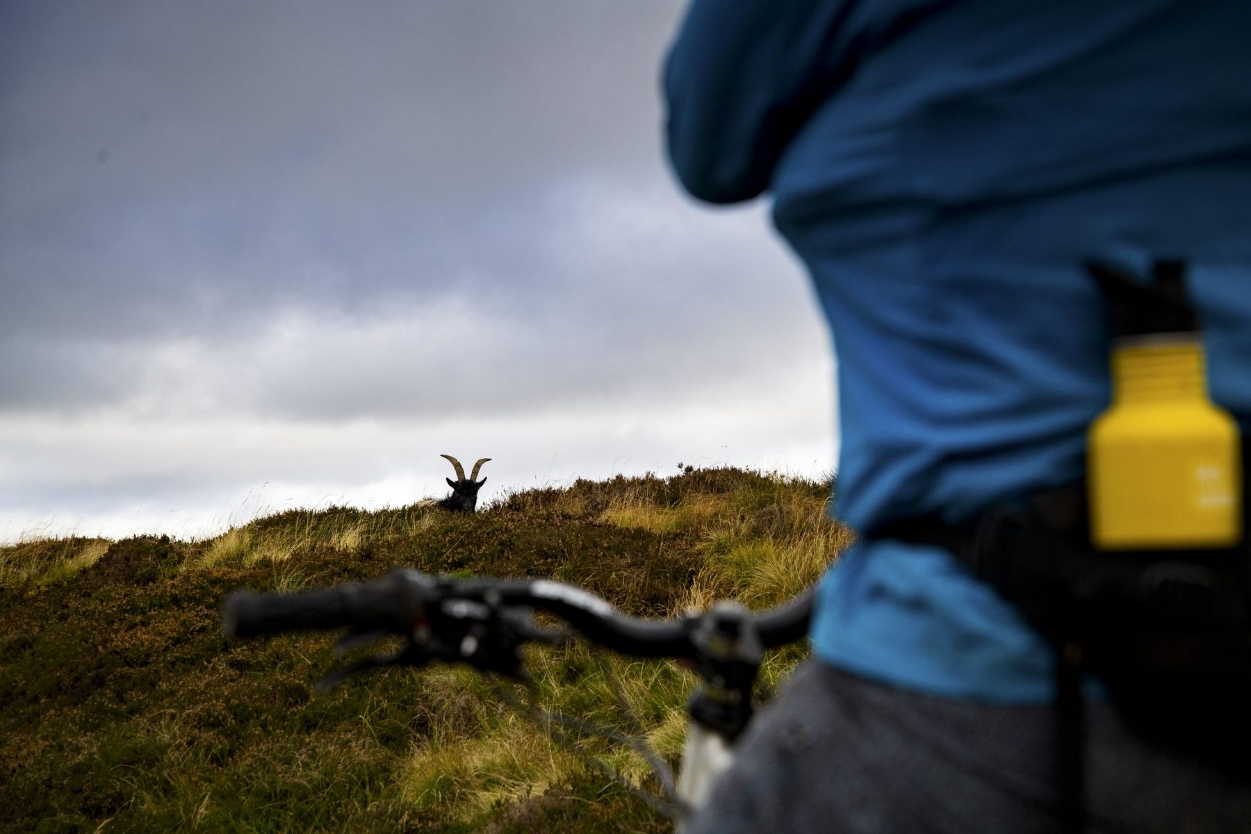 With frontier governance and land access thoroughly and pleasantly debated we set off down the western side of Windy Gyle, to which he gives a slightly less poetic description than his previous efforts. “It’s either flagstone or black muck.” He’s not wrong. We slither down an open wound on the hill made up of the peat that sits below the grass, offering no traction or consistency in any way. It’s an exercise in staying loose and reacting to what the bike is telling you. Thirty watery-eyed seconds later, we let the uphill of the saddle bring us to a halt, and we pick up a relic of the Roman era, simply known as ‘The Street’. Its counterpart across the valley, Dere Street, ran from York all the way into Scotland as far as the Antonine Wall. It’s here we happen across one of the feral goats that have roamed the land since the Iron Age, an animal with a beard almost exactly like that of Mastodon’s Troy Sanders.