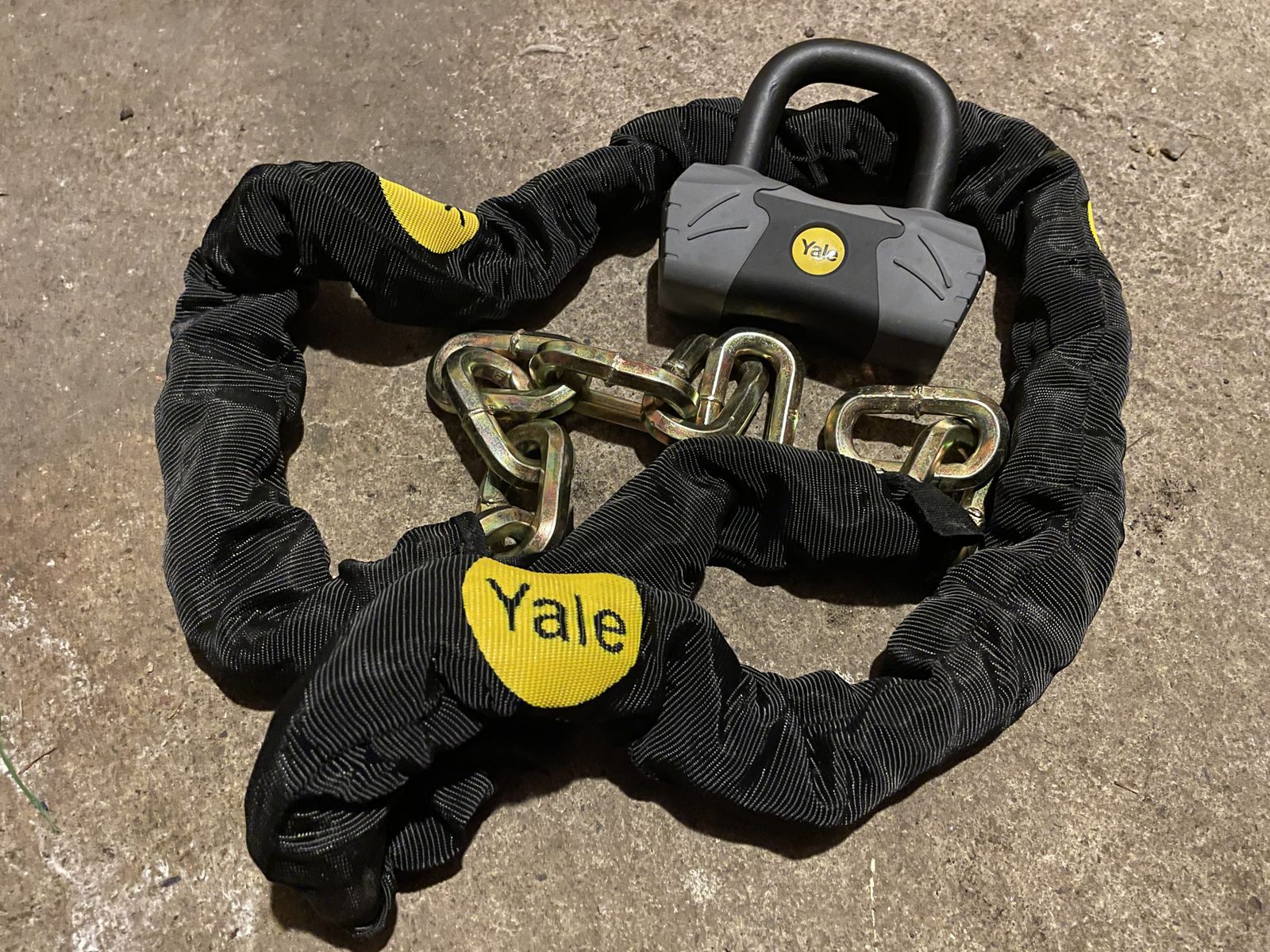 On then to chains. This one is Sold Secure Gold and comes in either 1.8m or 1.1m chain lengths. I have the 1.8m version. It is heavy, and nicely long, but there is no scratch protection on the ends of the chain where they stick out of the fabric cover, and I find the cover can slip up and down the chain. The loops on the chain are also all the same size, so not all the locks I have will fit through the loops (new New York Kryptonite lock is too fat). The supplied Yale lock is too small to be useful as a lock on its own as a D-lock. So, this will do the job in your shed – especially if you have a ground anchor and need a long chain – but it’s not so useful as a multipurpose item.