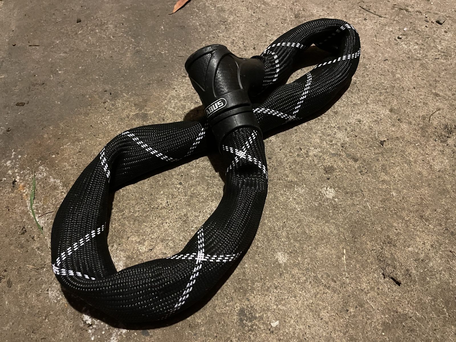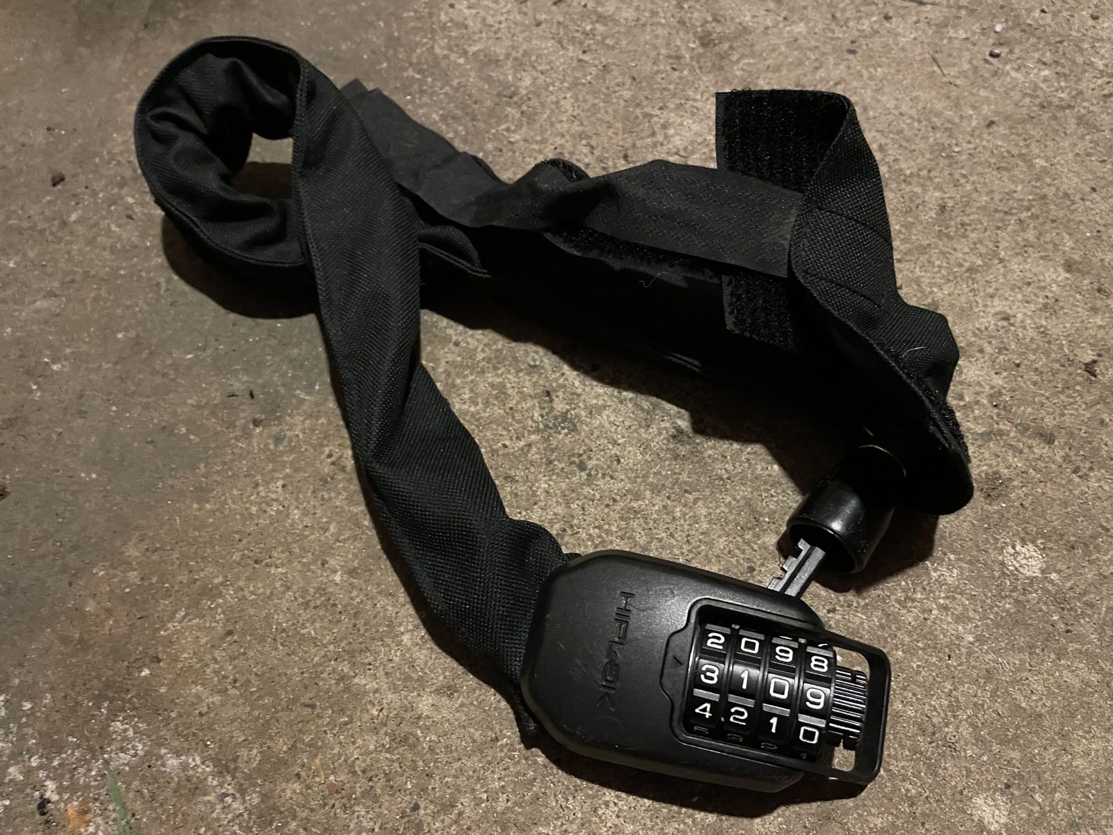 This Hiplok chain is very heavy, Sold Secure Gold, and has a fixed fabric cover right up until the end loops, which have a slightly rubbery coating to them. The loops on the ends of the chain are slightly larger, meaning I can use it with either the provided lock, or one of my other D-locks. It will also pass through itself, handy if you need a bit of extra length to reach between your anchor point and your bike, or if you want to put it round your waist to carry it.