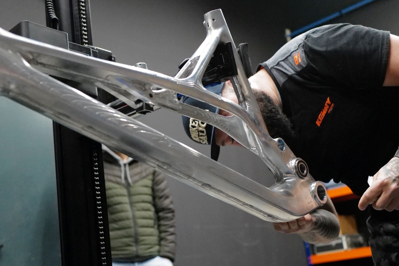 Thanks to their new manufacturing facility, and partnership with Forestal Group, Production Privée has used the new tech at their disposal to seamlessly move from steel to a cutting-edge CNC manufacturing process. The PP DH frame is machined from solid blocks of aluminium which are hand-welded together in Andorra to create a monocoque frame stiff enough for the roughest of UCI DH tracks.