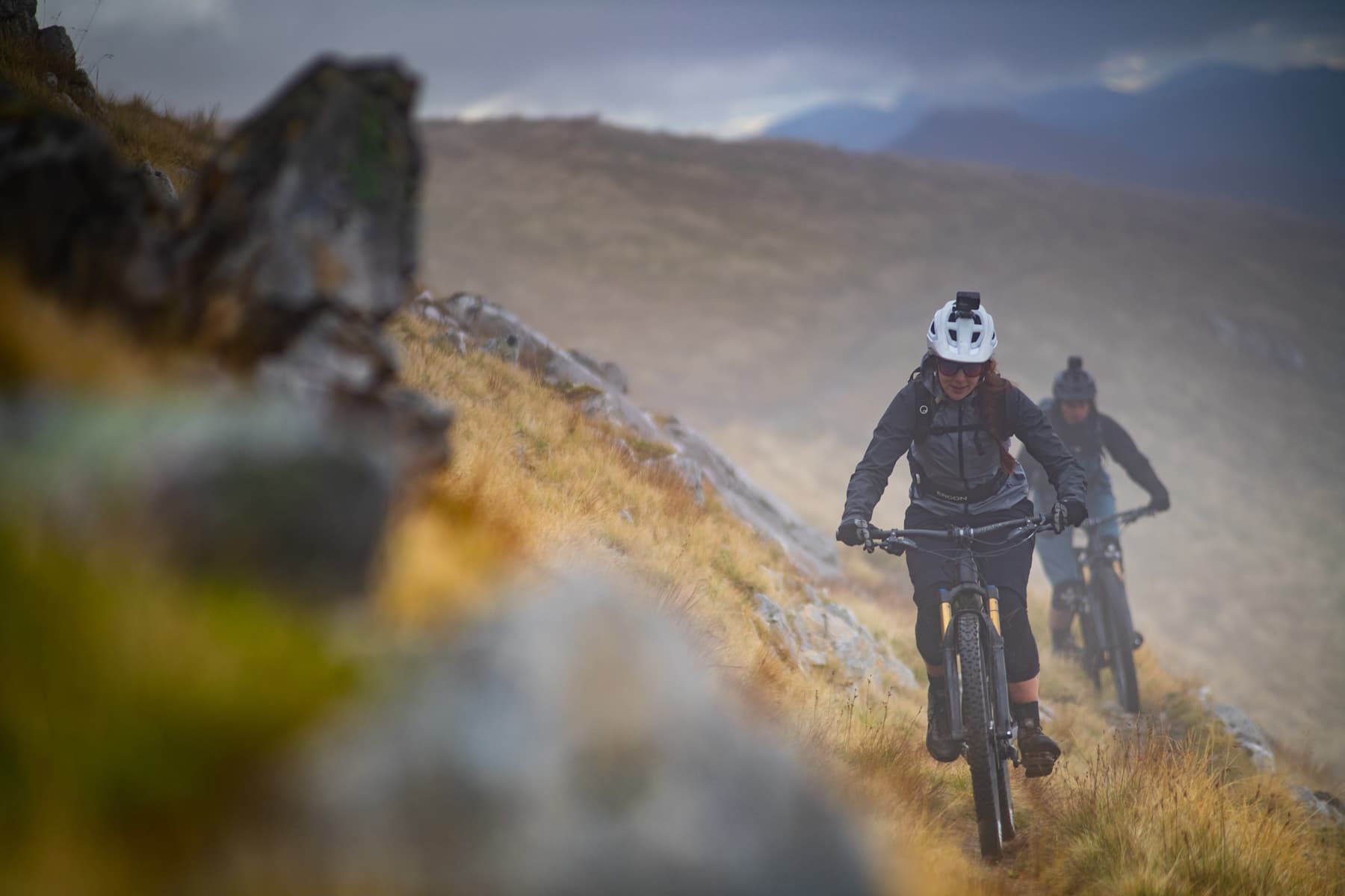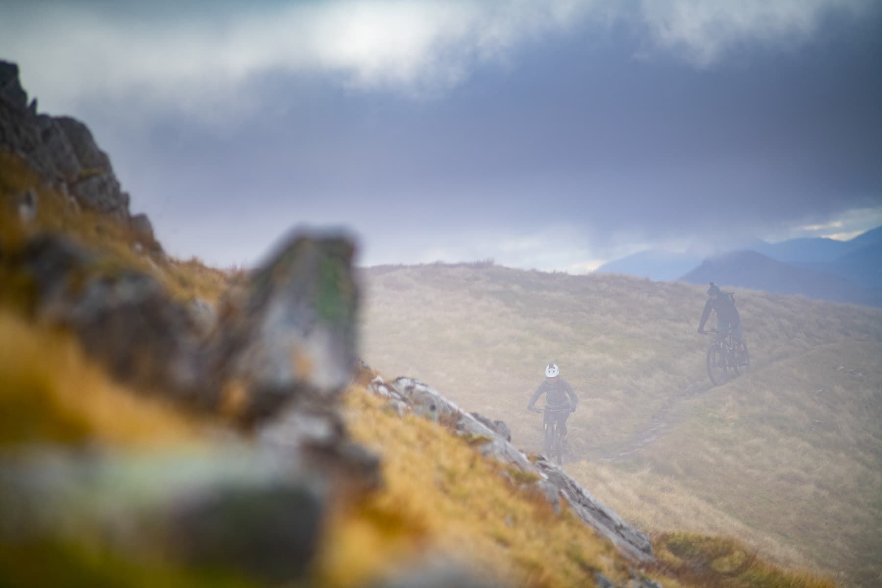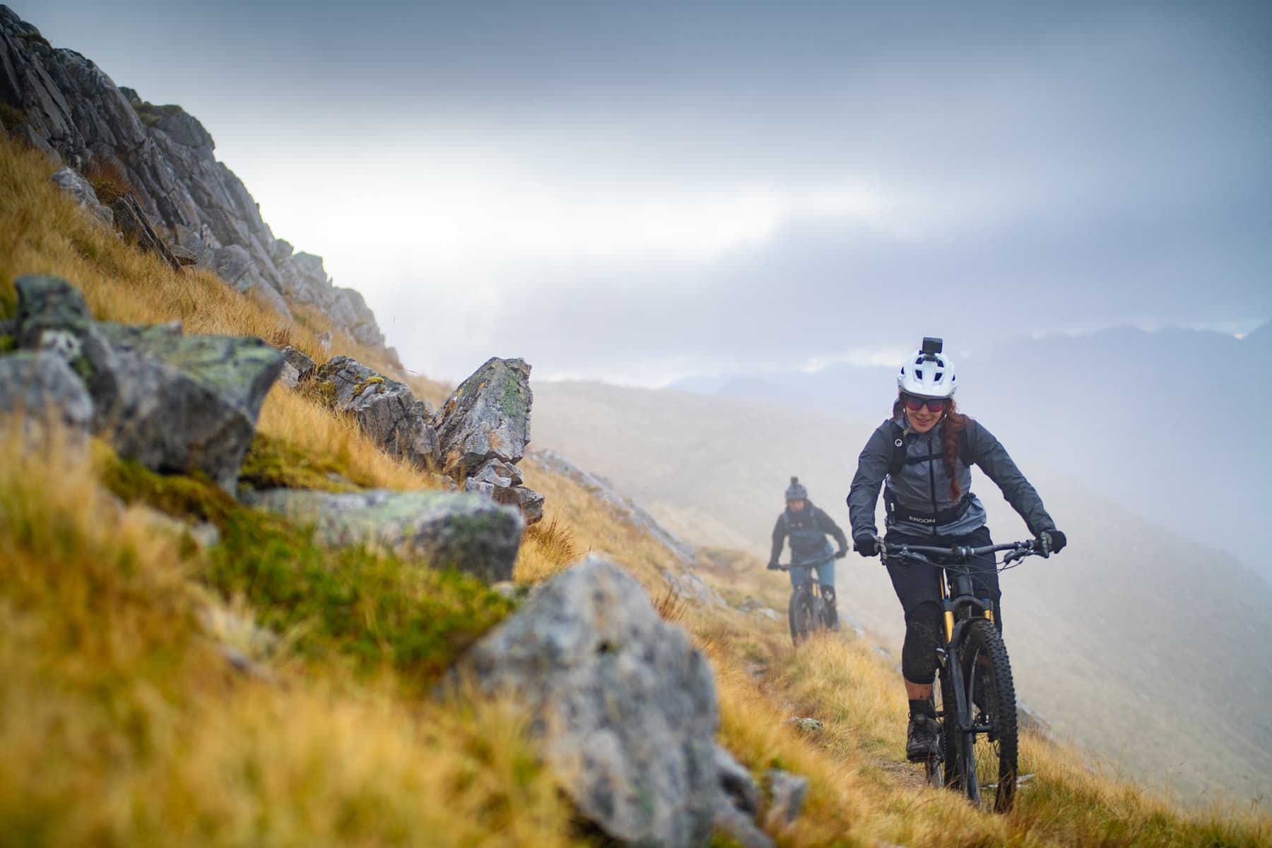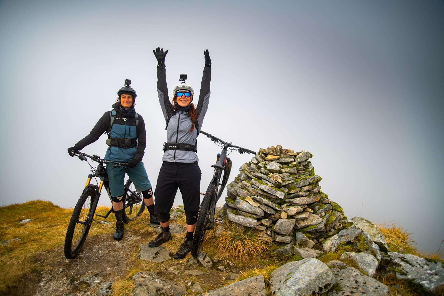 As we finally arrive at the cairn I realise we’ve been cheated out of the views I’m used to seeing on Pete’s photos from his highland adventures, thanks to our cloud that apparently has separation anxiety. But I’m at the peak of my first Munro with two of my best friends. It’s a disorientating feeling to know how high up you are with only a subtle hint of the glen below through a dense cloud. I’m secretly grateful for the impaired vision as there would no doubt be some wobbly knees on me and Vicky, being completely out of practice on big mountain rides. This false sense of security takes me over as I blast off from the top on a rather exposed and rocky section of trail, only to discover at the bottom that I’d locked the shock out on my short-travel bike. Pete tells me I’m a lunatic for riding the most technical, exposed part of the entire trail, but I can see him beaming with joy that we’re about to have a good descent.