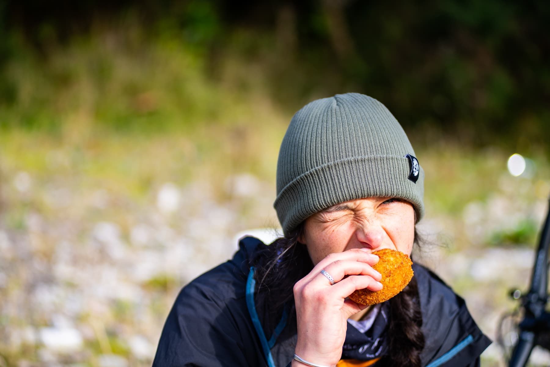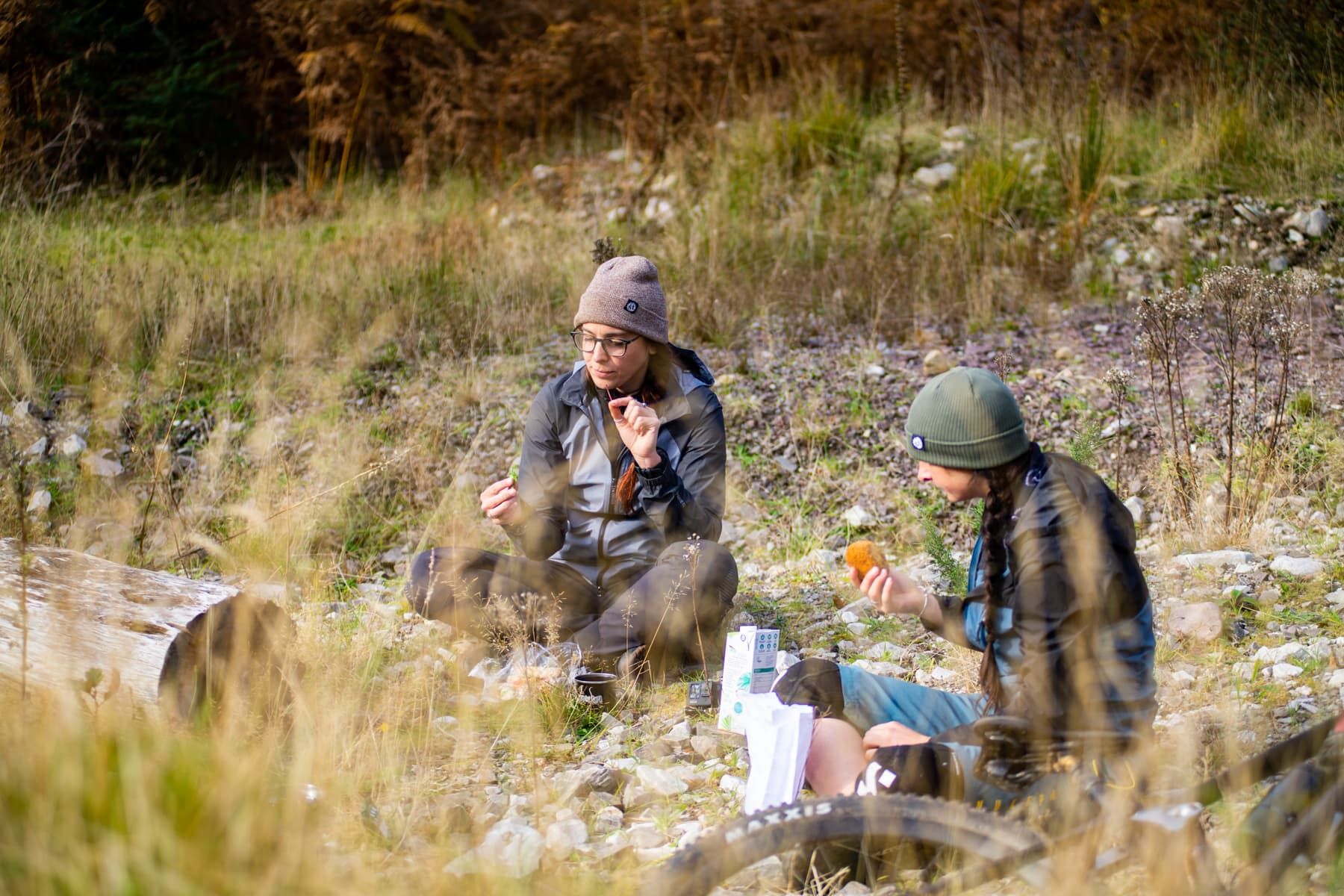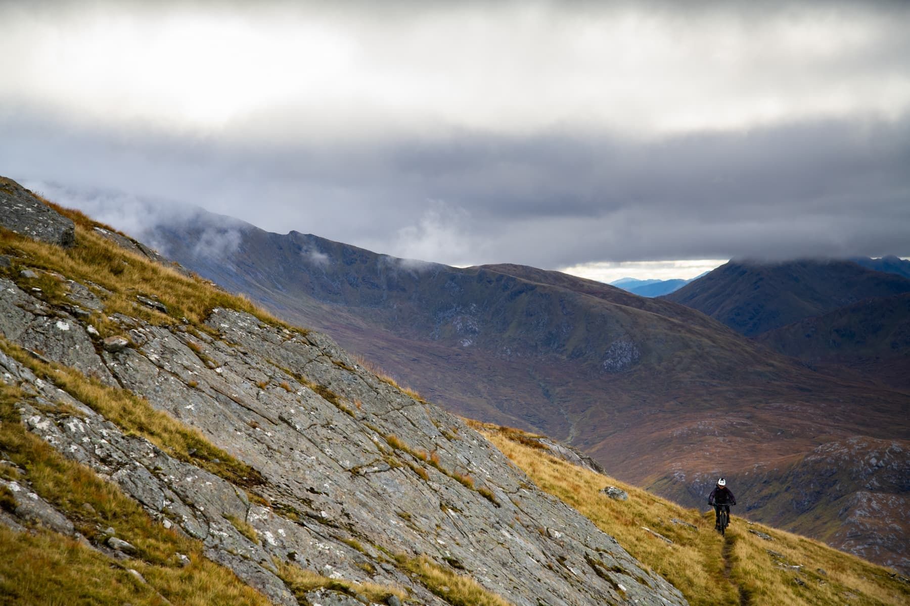 The first part of the ascent up Gleouraich is ridable, gradually stretching into a climb that requires excellent line choice and your weight over the front of your bike – eventually it’s a push. Steep, tight switchbacks with narrow exposed transitions between each one. Vicky has never been good with exposure, something she has voiced enough times for me to be considerate of it, so I keep checking she’s still keen to ride. She’s pleased to not be feeling fazed by the sudden height gain with a very sheer drop to one side. Thanks to the coordination issues Mother Nature gifts me each month, I’ve adopted Vicky’s exposure nerves and I have a bit of a clumsy fumble that eventually leads us to a snack stop.