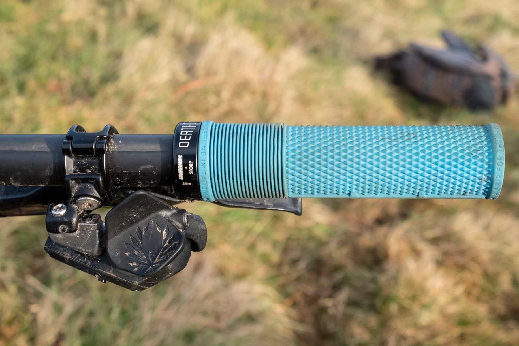Other points of the bike are a mix of my favourites as well as whatever I had in the shed. The tyres are a well proven pair of Maxxis Minion DHR, stickier front, rollier rear. The saddle is a fabric/camo DMR OiOi model, which happens to match the AMS mudguard. Finally, the bars and stem are a Truvativ Descendant combo, short and wide, finished off with DMR Deathgrip grips in ‘almost matching’ blue.