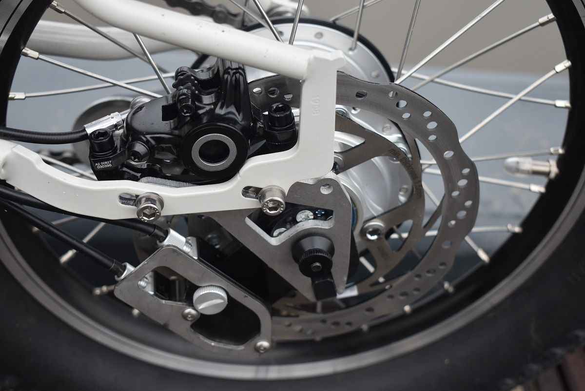 Designed for a customer in Greece who wants to use it to tour on rough roads and tracks, Ben has gone to town on the build. Out back, there is a Rohloff internally geared hub, beloved of so many tourers the world over. In place of the standard rim brakes are a set of Magura hydraulic disc brakes while the big clue to this being a bike that is more than a little out of the ordinary is the presence of the 3 inch wide tyres running on the still teeny tiny toty 16 inch rims. Curiously, it doesn’t look in any way odd but seems to really suit the character of the bike. In order to make these changes, Ben had to get handy with his welding torch and fashion an entirely new rear end and fork. Well-practiced in the art, it is fair to say that the rear triangle and fork looked as if they came with the bike as standard. The quality of the welding and overall finish were, to my eye at least, indistinguishable from the standard design.