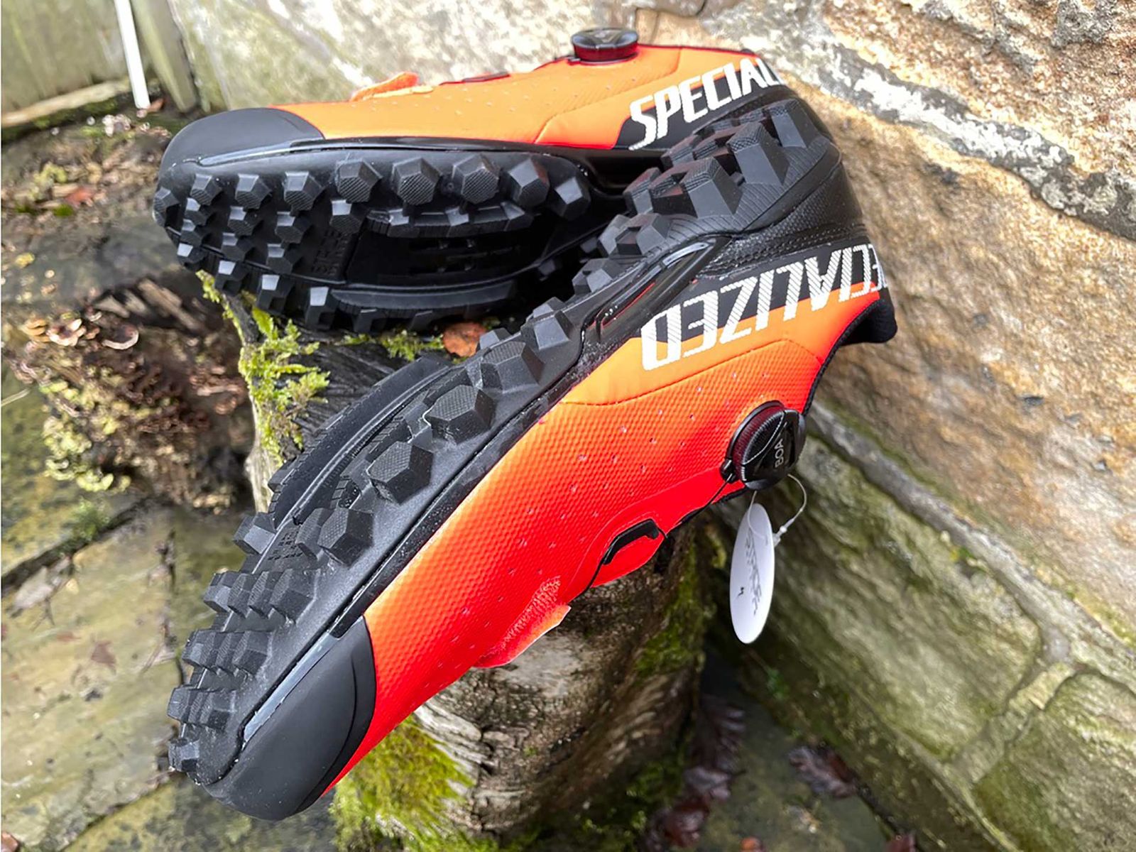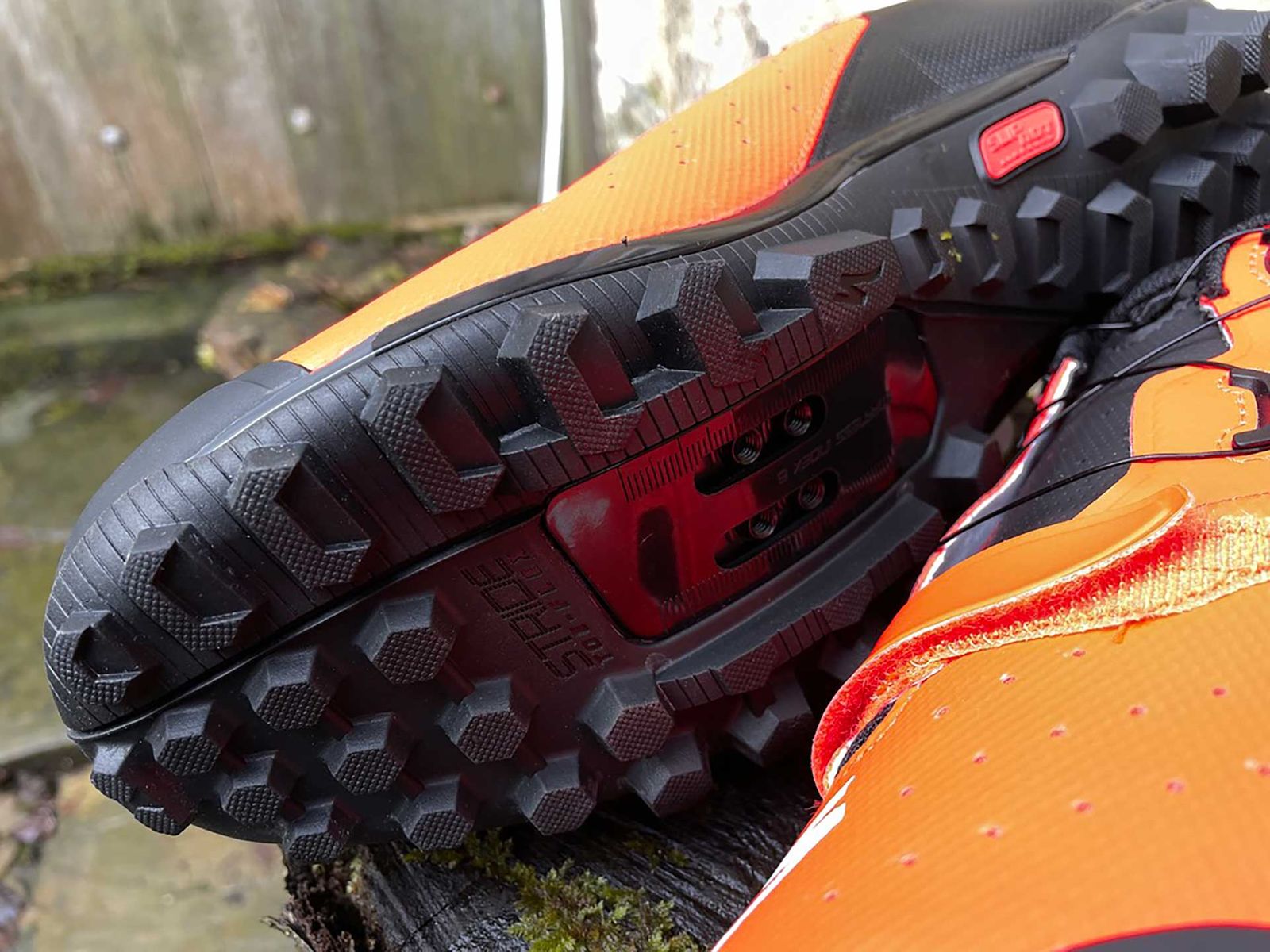 Wow, these are some bright shoes! The Specialized Recon 2.0 shoes are an all-round performance trail shoe for clip-in pedals. They feature a stiff sole that then magically transitions to flexible at the toes for extra grip for those steep ‘I’ll walk back up there and have another go’ kind of moves, as well as regular hike-a-bike stuff up mountains in the Lakes. For a Californian-designed shoe, they’re VERY knobbly too, which gives them great grip in mud and general wet, British landscapes. And they’re bright – like Dyno-Rod van bright orange. If you can’t do them justice, there’s a full black version too.