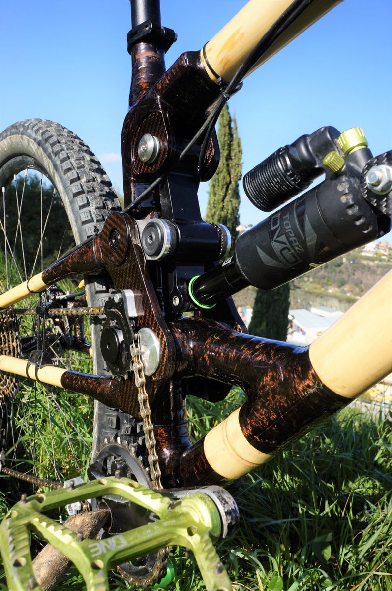 I made the carbon parts (swing arm plates, pivot and shock mounts, chain-guides) using a super cheap (200 euro!) CNC machine from Aliexpress! it even has a laser module which I used to create the stencils for the artwork. I’m so happy with that bit of kit.
