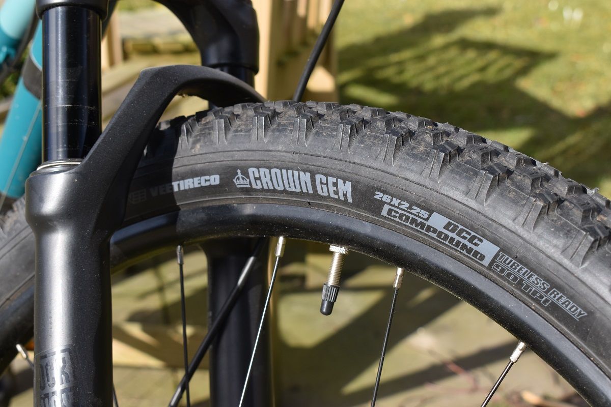 In this case, Islabikes’ own branded 6 bolt disc hubs are matched with 24 hole Stan’s Crest tubeless rims and Vee Tyre Crown Gem 2.25” tyres. Not being ridden by 20 stone’s worth of clumsy IT consultant, the low spoke count and lightweight rims make for a fast rolling choice for the intended user.